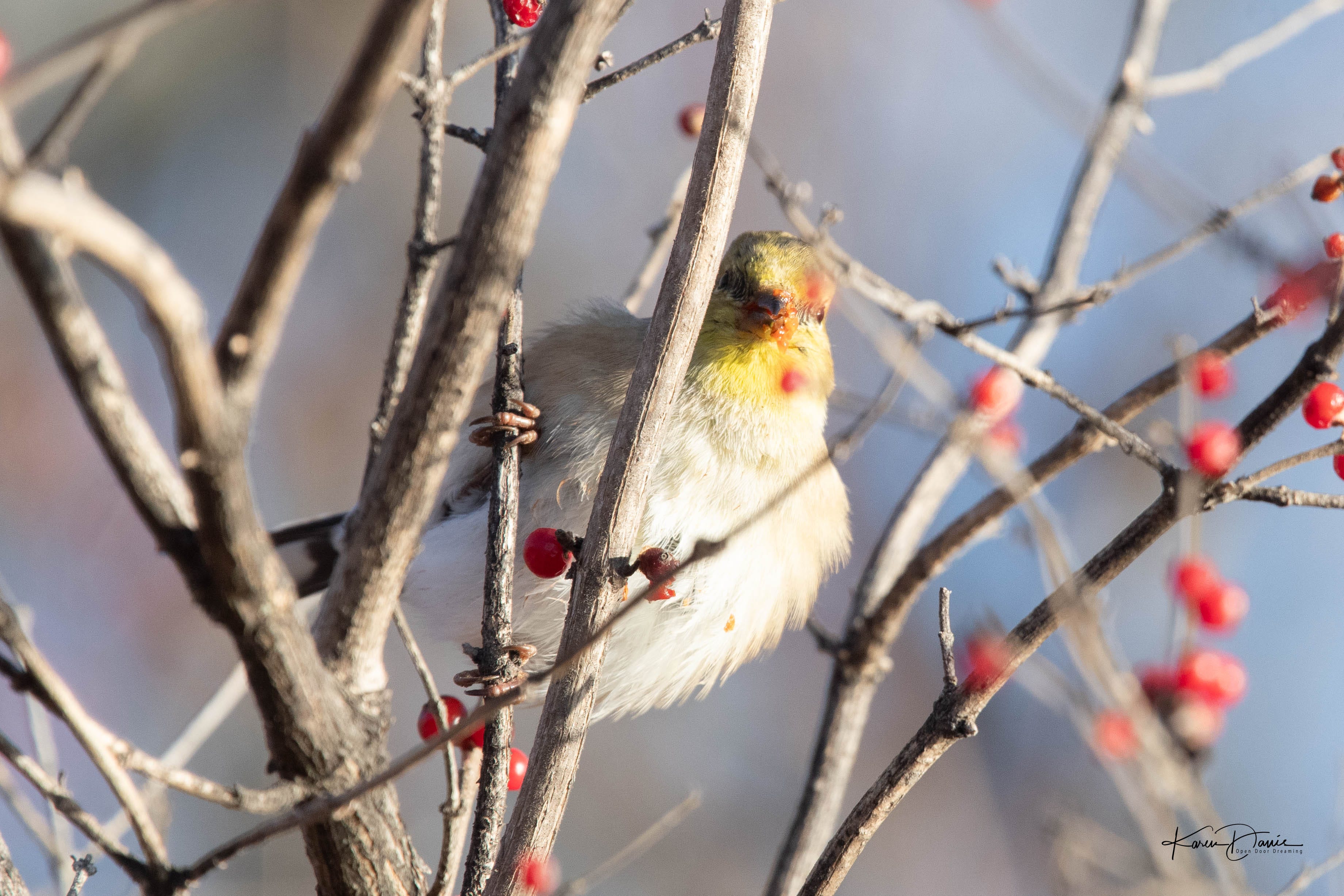 Hey buddy, you’ve got a little berry on your lips. (goldfinch)
