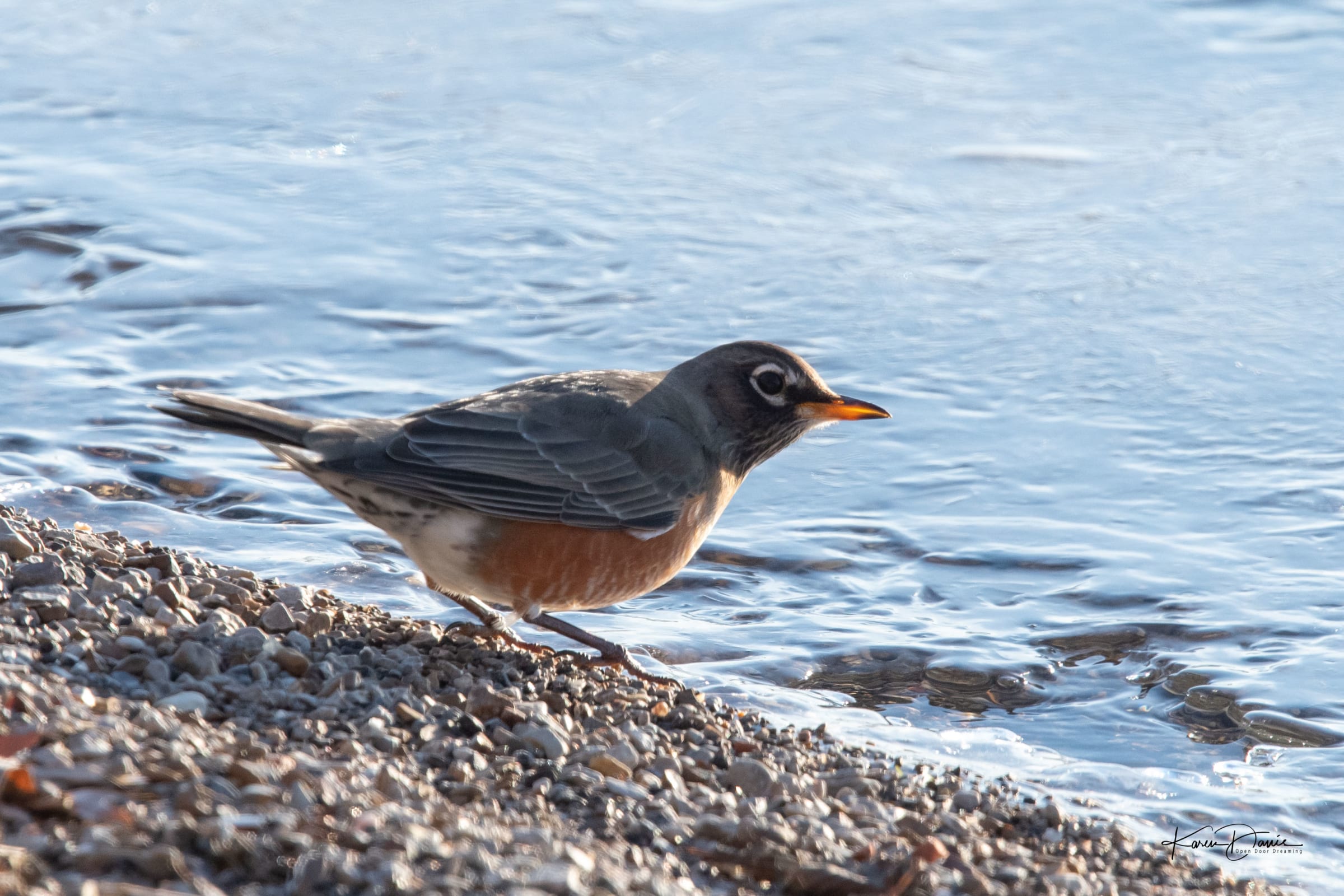 Robins love the water’s edge, whether it’s liquid or frozen.