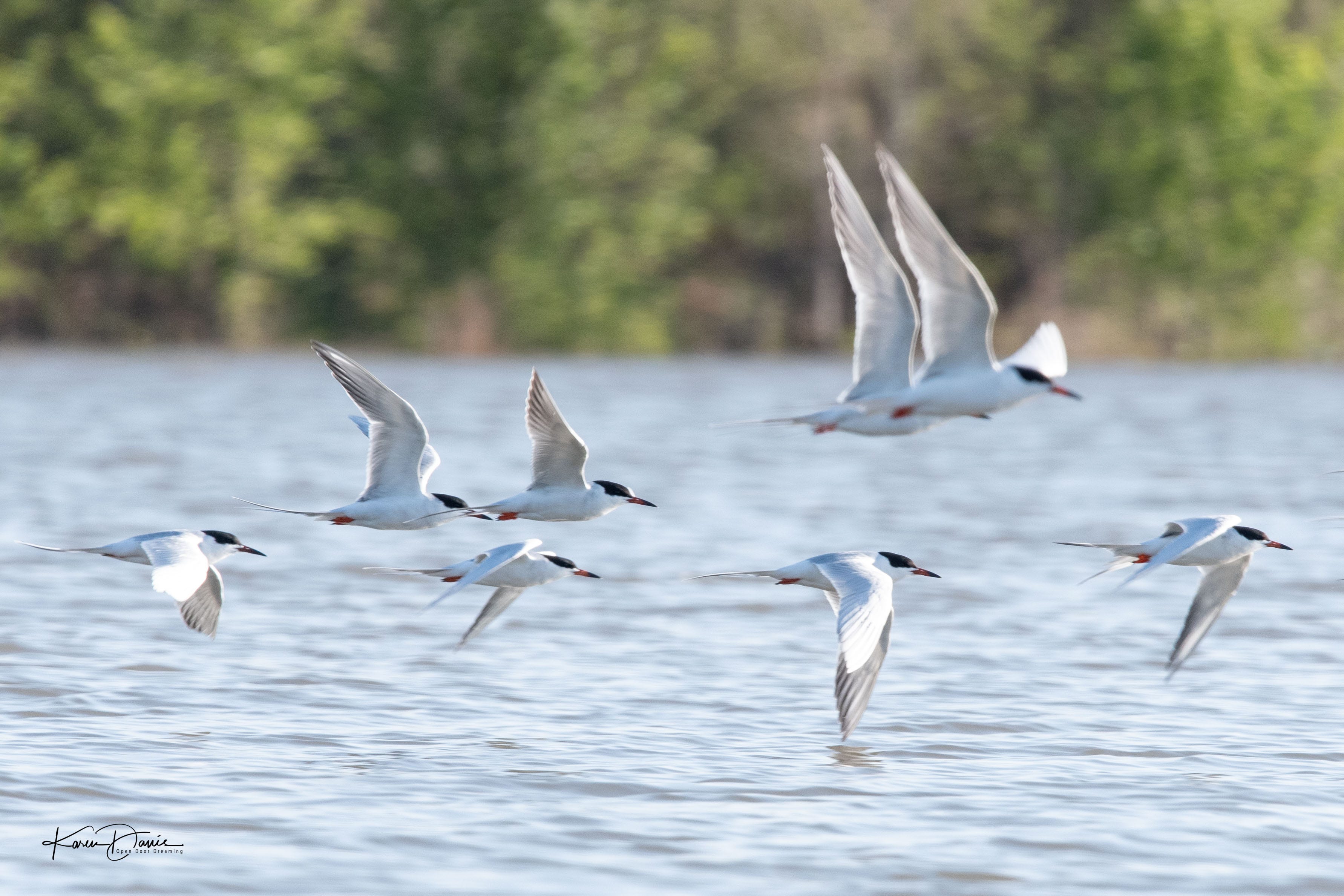We had three varieties of tern visit this year. First up, the Forster’s terns. Forster’s terns travel in small flocks (I usually see 3-15 at a time) and I saw them several times way out in the lake. Finally one day they came close enough to take some photos of their amazing mid-air acrobatics! Forster’s terns are medium size terns, a little smaller than the smaller gulls. (Average weight = 5-7 oz, wingspan 30-31”)