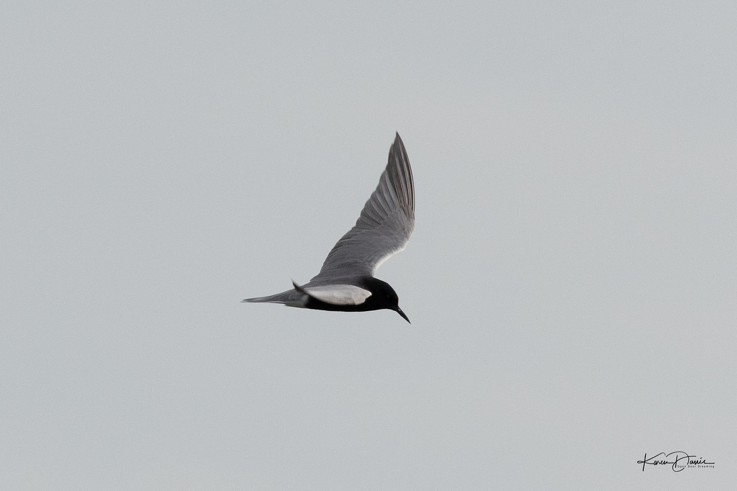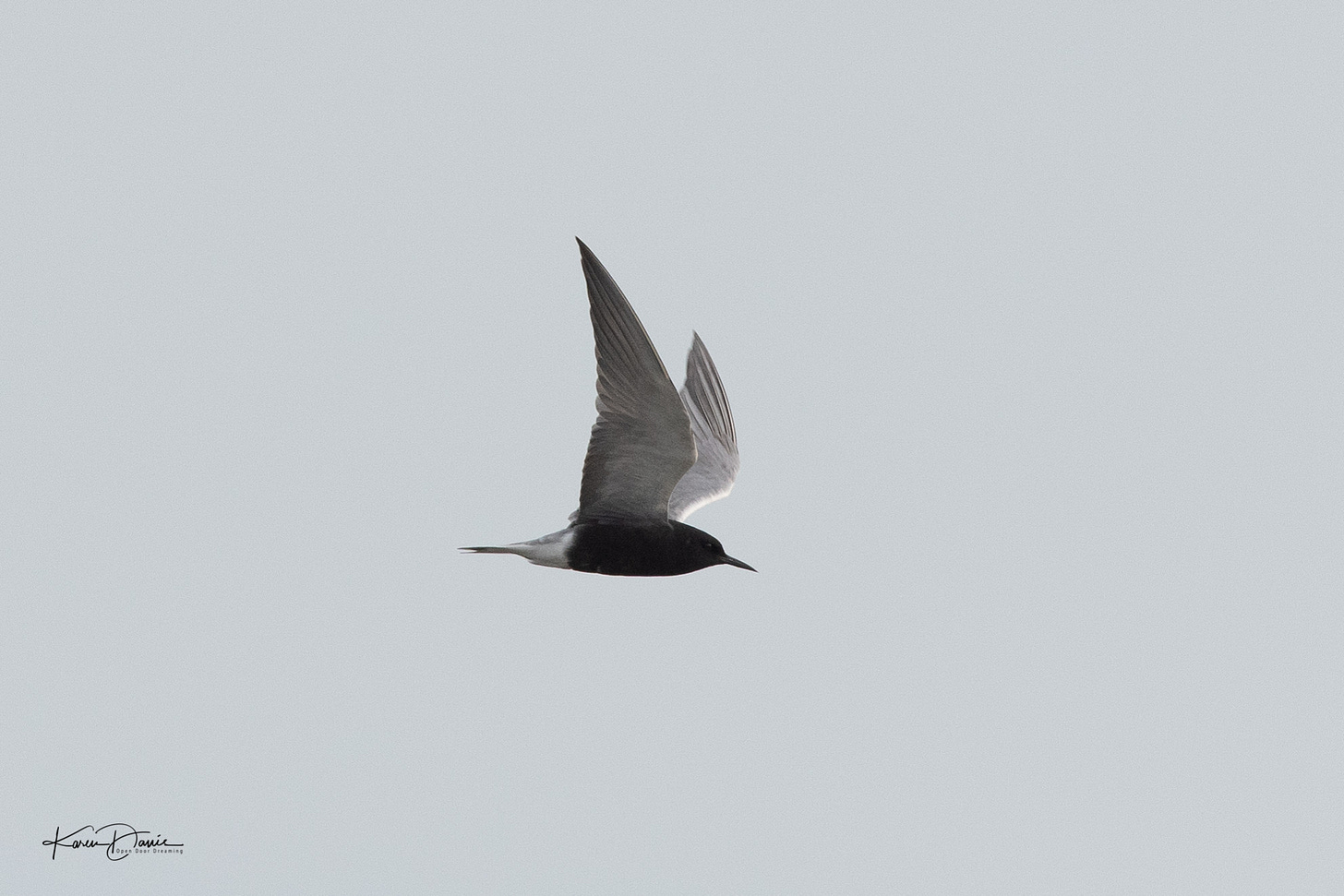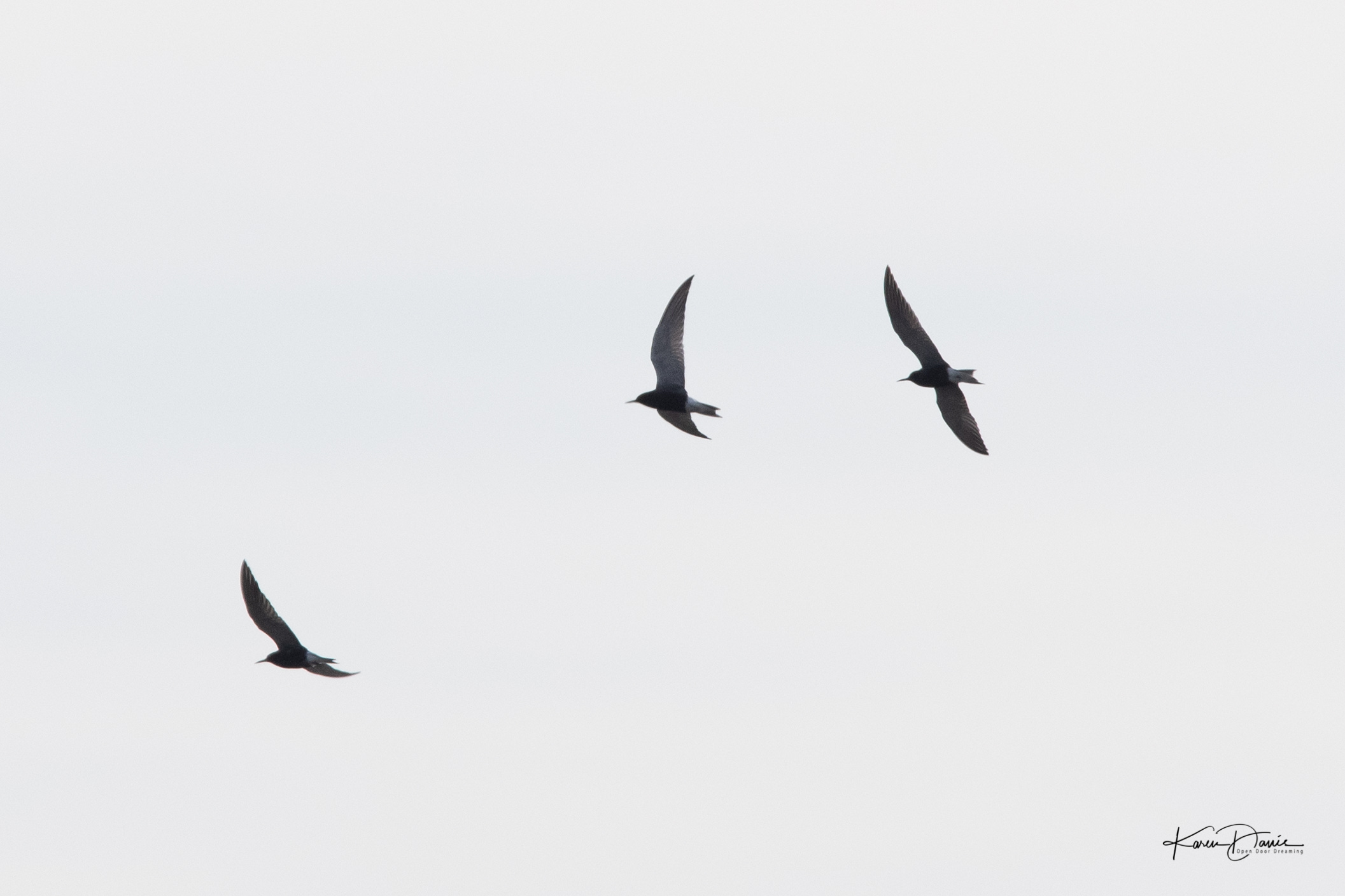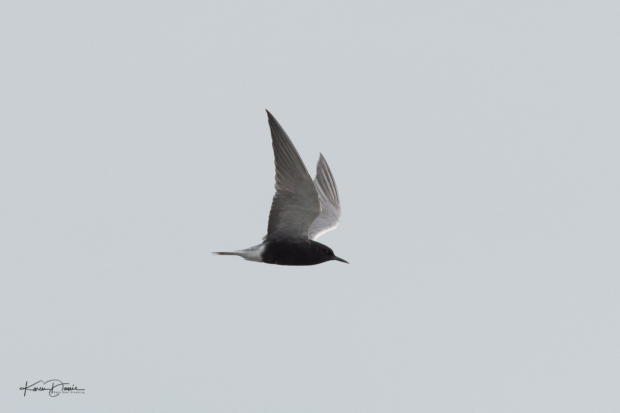 Next up, the black terns. Black terns are nearly the smallest of the terns that pass through here but still about twice as big as the swallows. ((Average weight = 2 oz, wingspan 22-24”) I say nearly, because there is a (slightly) smaller tern called a least tern, but in a decade of watching birds here I have only seen them once.