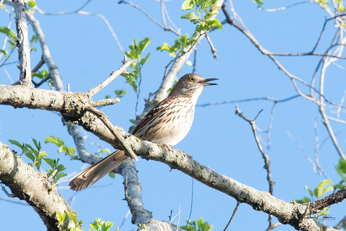 I stood outside while waiting for a follow up appointment at my doctor on Friday morning, after the virus had finally decided to depart. They asked me why I was standing outside instead of sitting inside and I pointed to the brown thrasher singing his R2D2 song at the top of the tree.
