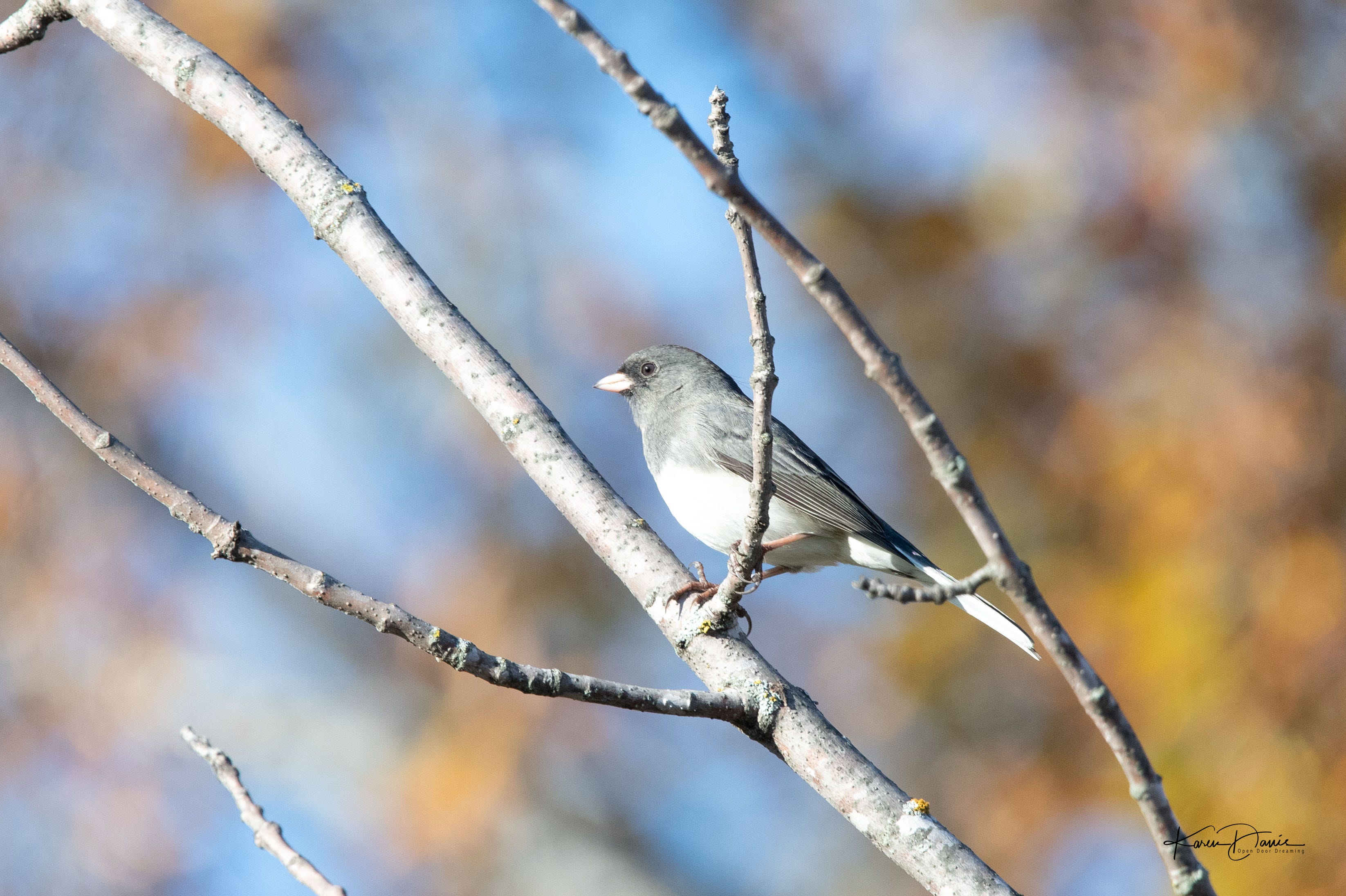 The juncos have returned and are busy flying up and down between the ground and the trees.
