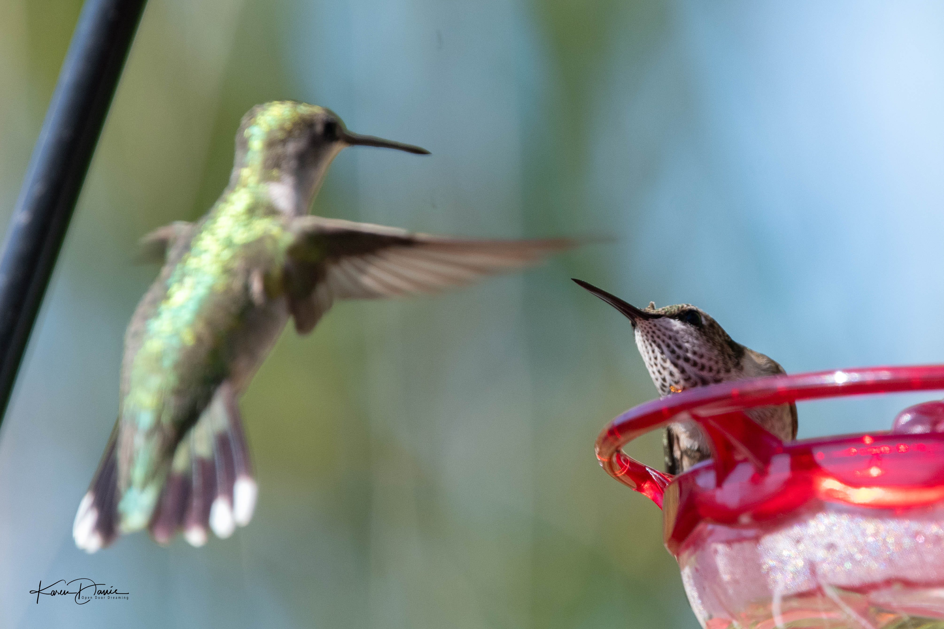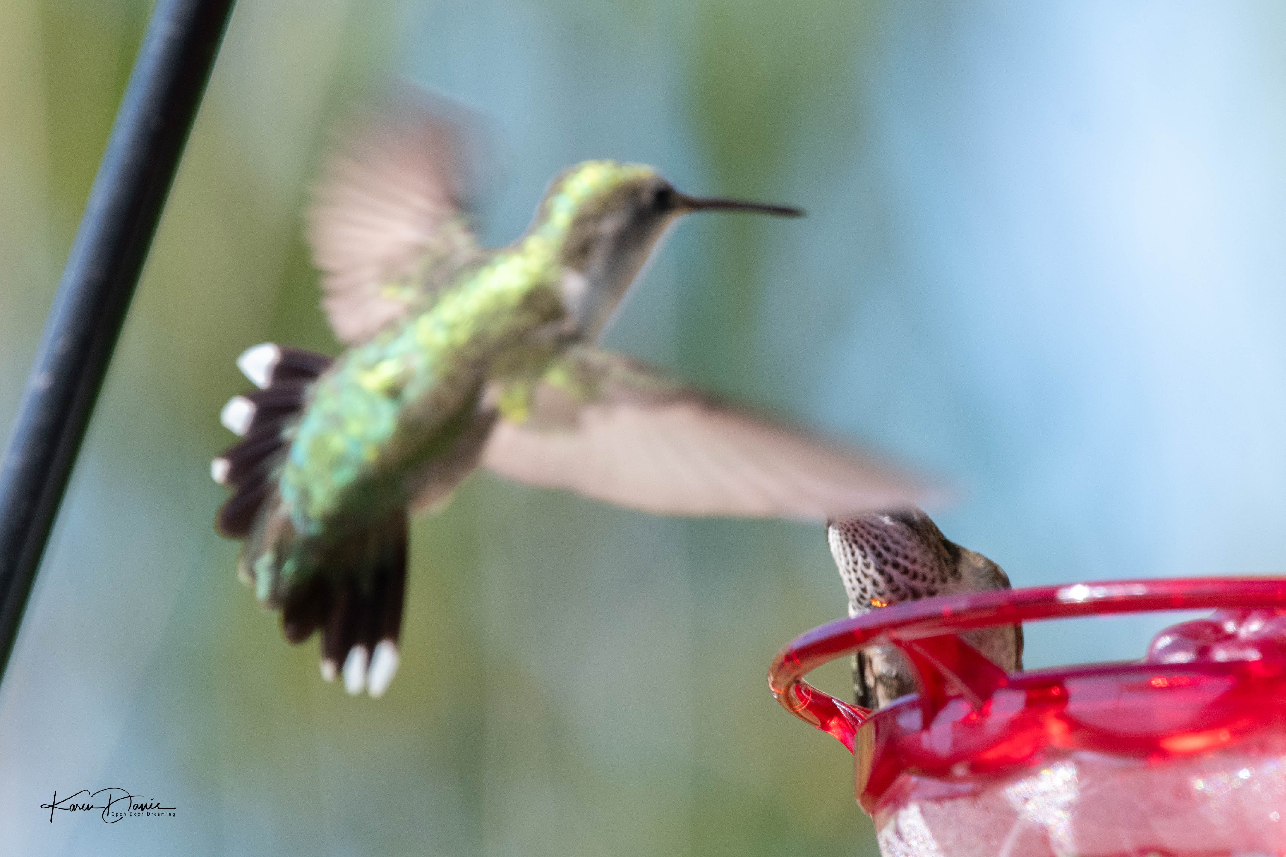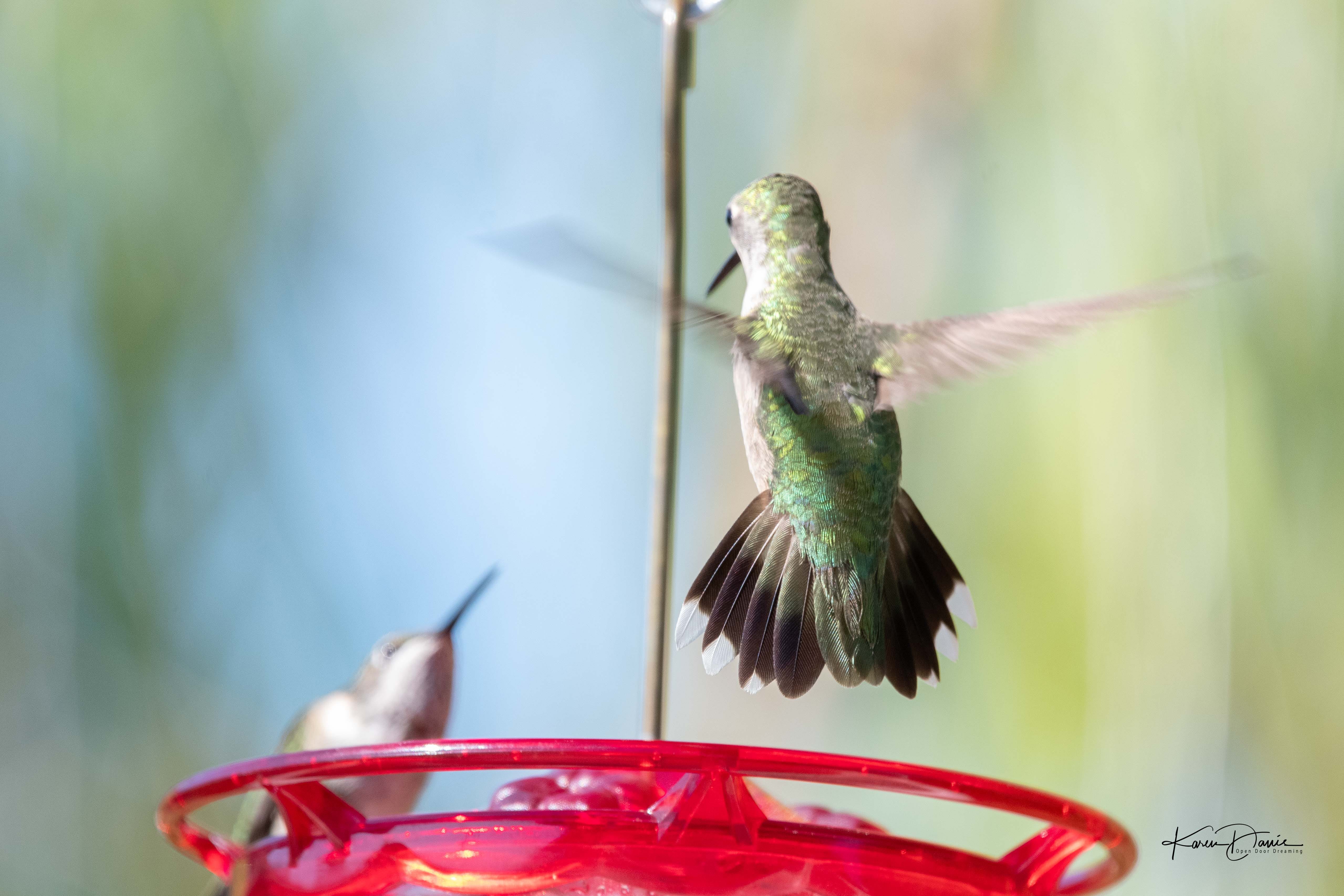 One day I had quite a “discussion” going on at the feeder between a young male and what I think is a female. She was really not into his shenanigans, but he was fiercely persistent!