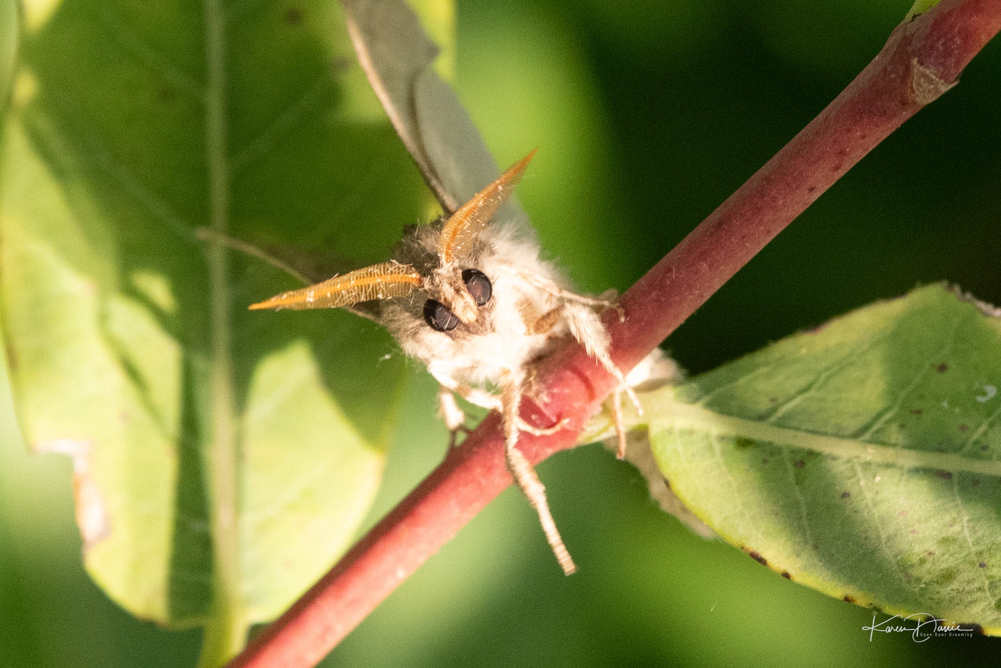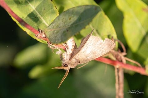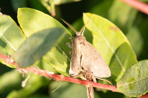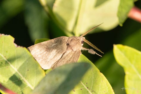 This moth was working the bottom of the leaves with intensity, my guess was laying eggs. Look at those feathers for antennae and the puffs on her legs!