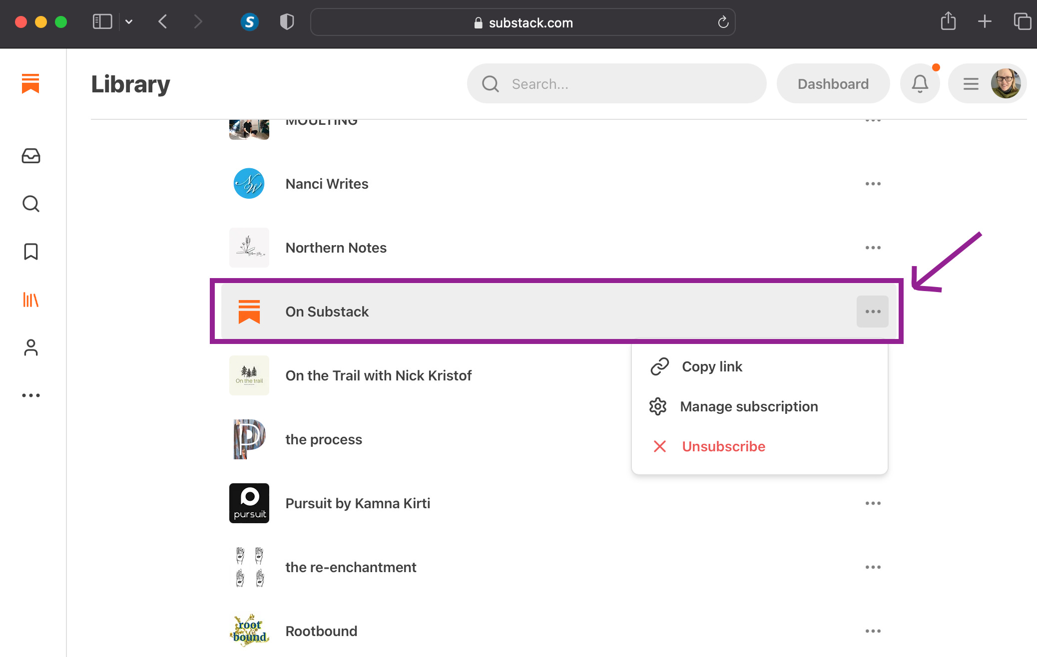 Scroll down and find the various Substack publications. Click the three dots on the far right side for a drop down and choose “unsubscribe”. (In the app, the three dots are at the top right after you’ve clicked on the publication.)