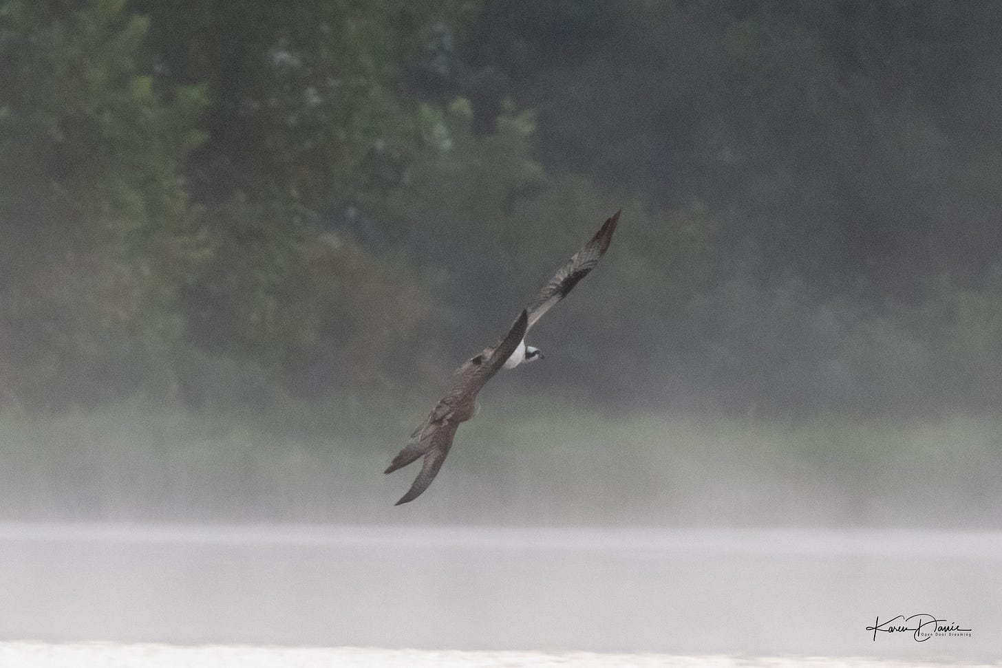 It’s nearly sunrise, the sun hasn’t quite crested the hills to my east. There’s fog over the lake because it’s a glorious 57 degrees (F) in August. I’m waiting for the sun to rise and walking slowly along the shore when I hear a crow going crazy and see two birds flying down the lake from the north. The second bird is clearly chasing the first bird which is diving and spinning to avoid contact. They aren’t quite close enough and my mind tells me it’s a crow chasing an osprey - which doesn’t quite compute because I’ve never seen a crow chase an osprey. I take a few photos but I presume they will not come out because the light is too low and they are too far away.