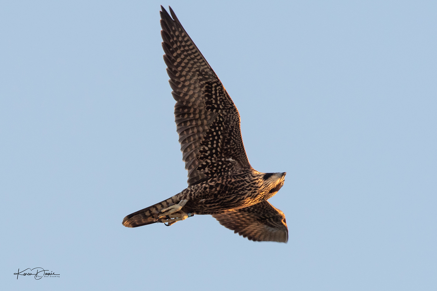 It’s only the sixth time in ten years I’ve seen a peregrine falcon at the lake. They have all been in the fall, never quite this early, and always a first-year falcon. This one too is a first-year falcon. It’s not until that evening when I am looking at my photos I realize it wasn’t a crow at all. BOTH birds were peregrine falcons! I have never seen more than one peregrine falcon. Both birds were first-year and I can read the band on one bird’s leg in my photos. I submitted the band to the USGS Banded Bird Encounter Reporting sight and will be curious if I can find out where this young bird was banded.