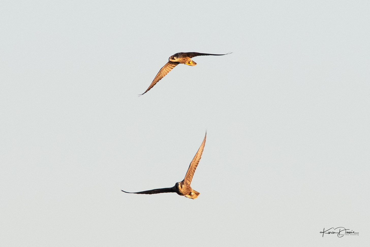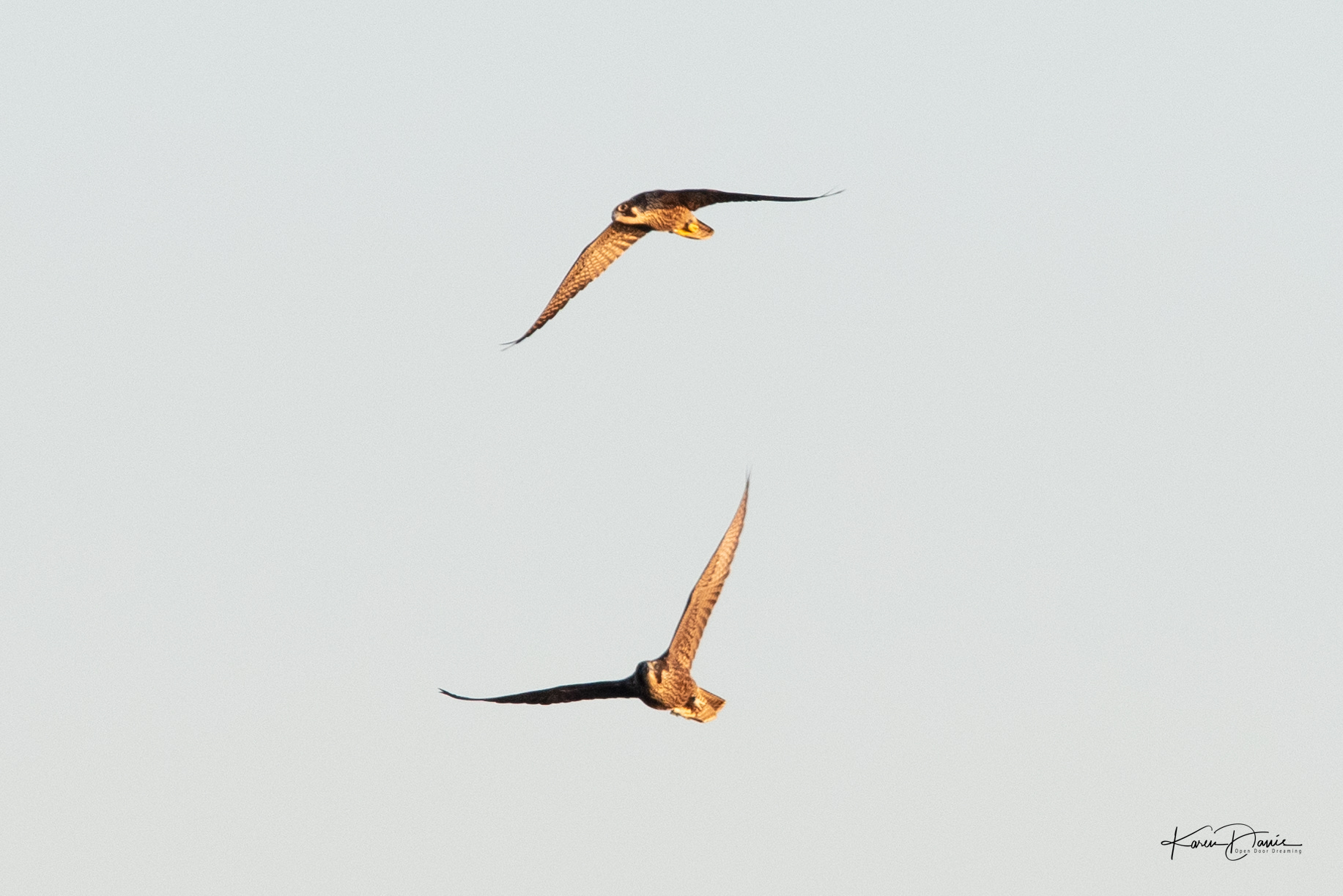 The next thing I know two birds are coming towards me, one chasing the other. I can hear the crows so my mind again computes this as a crow chasing an osprey. This time the light is better as the sun has crested the horizon. The birds come closer. As I’m looking at the bird being chased through my lens it suddenly clicks - that’s not an osprey, that’s a peregrine falcon!