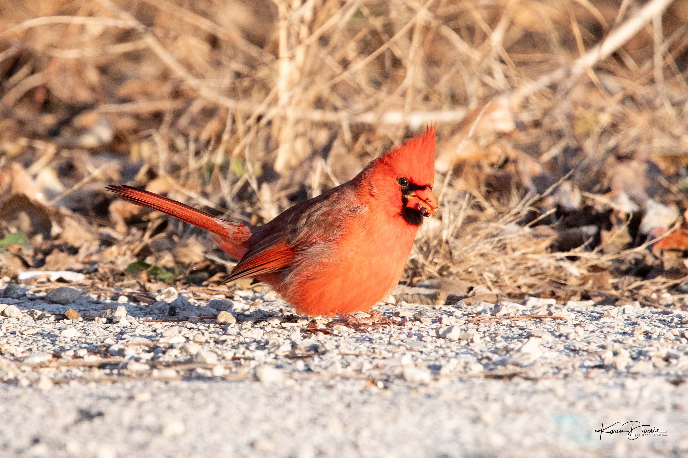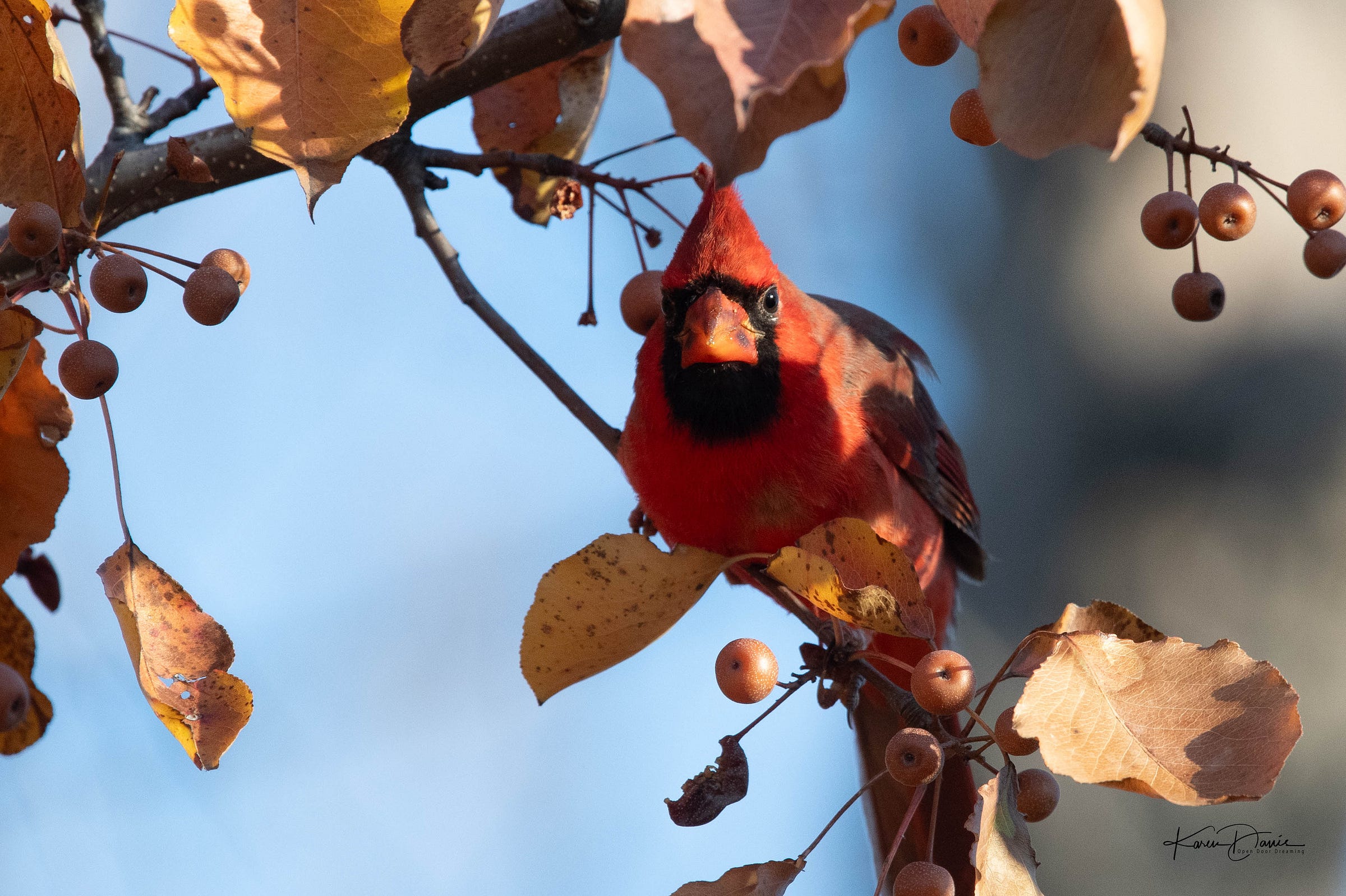 Cardinals fly in and out now, too. Most of the year, the males will hide from me behind the leaves, but now, as the leaves fall away, they have to be bold if they want to share in the berry bounty.