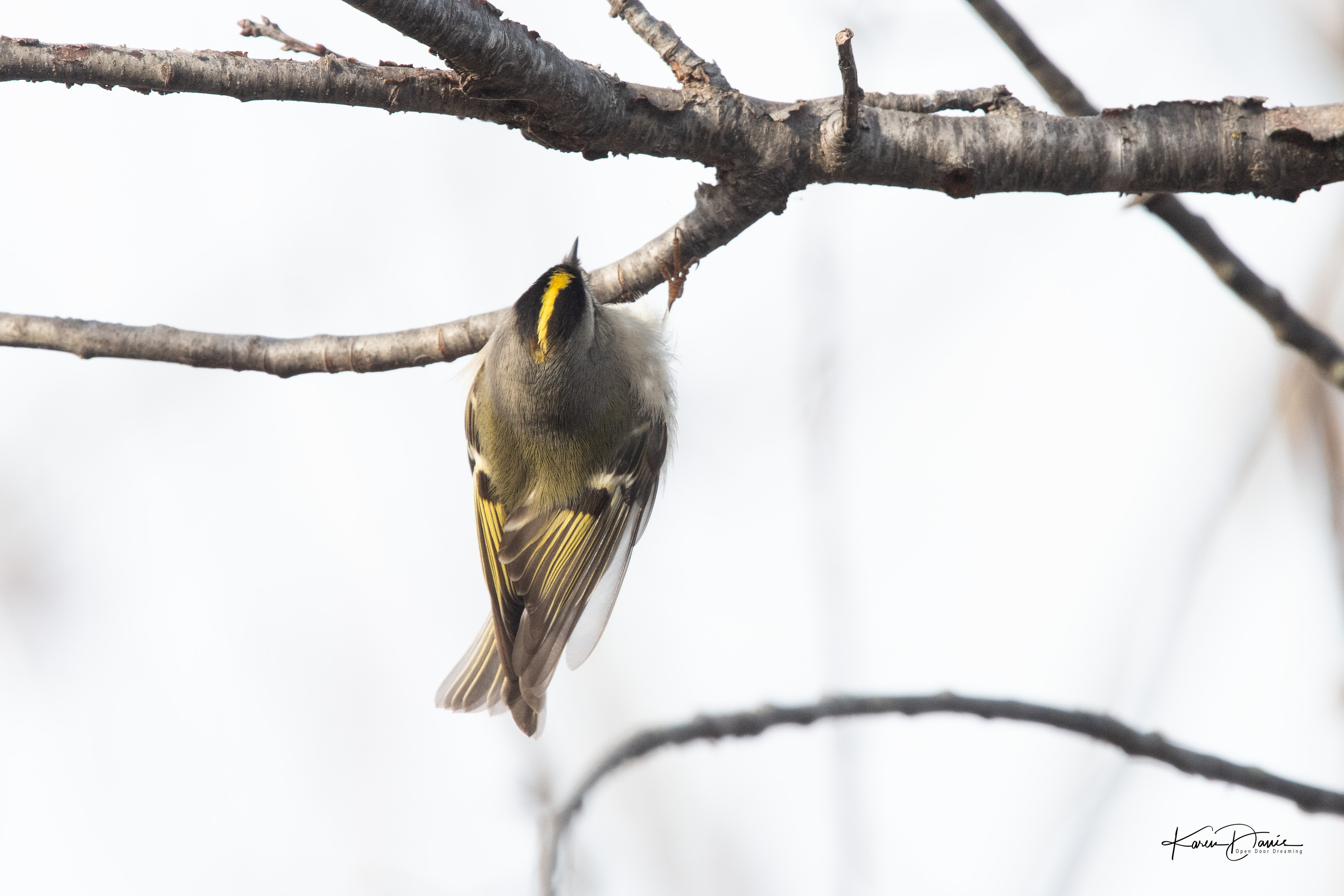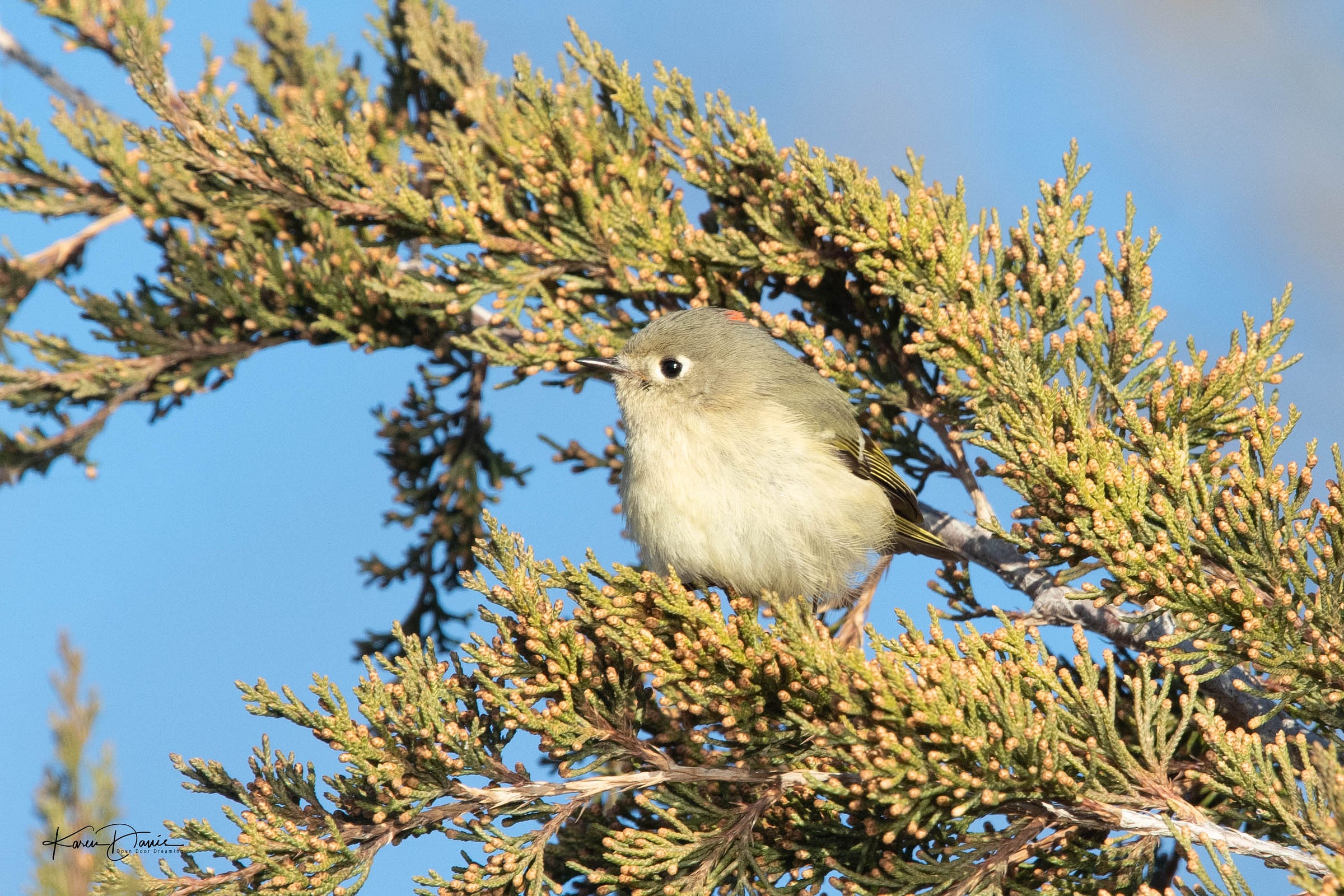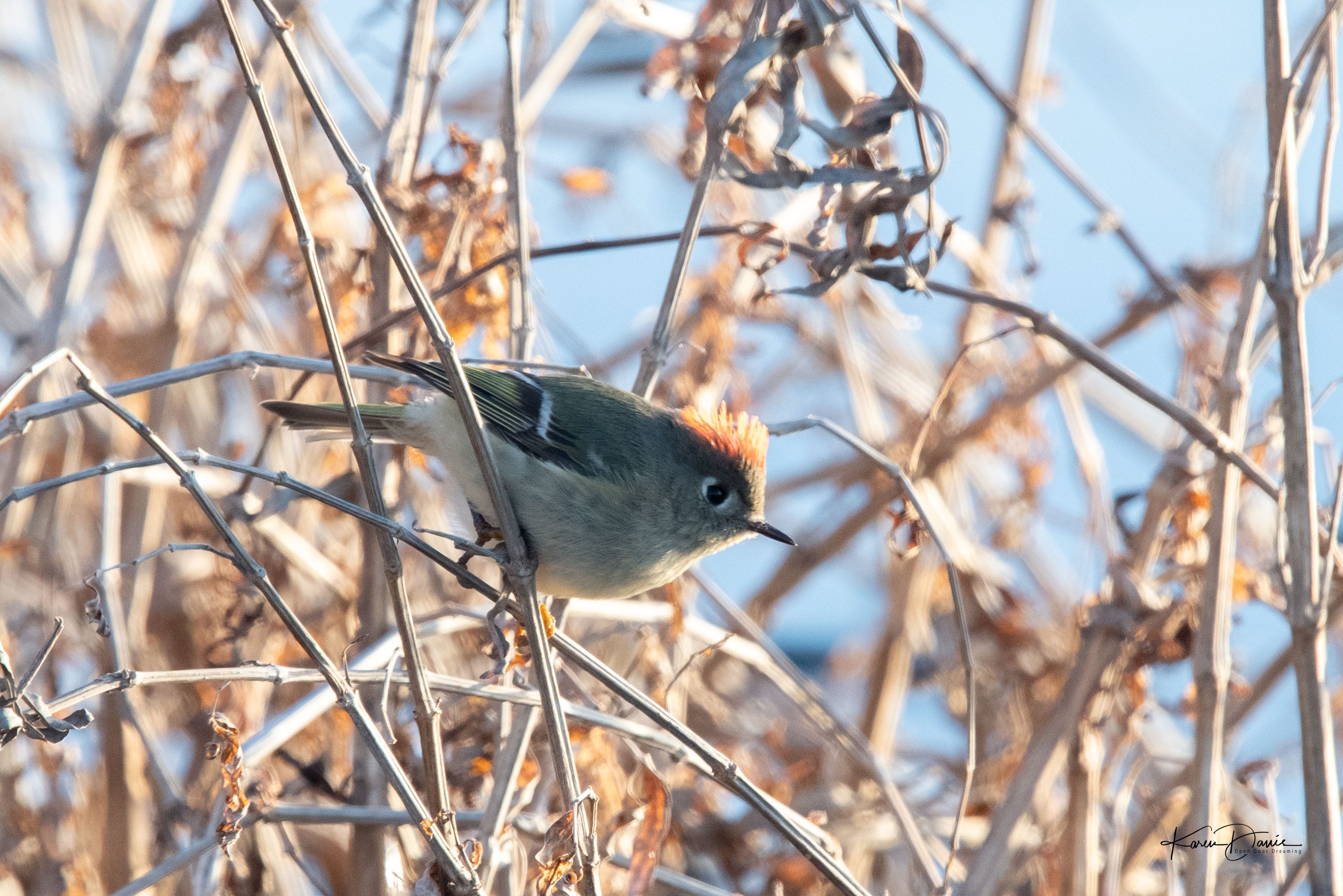 A second kinglet zips in, and suddenly the first kinglet pops the crown up on his head. I don’t know if this second kinglet is his sweetheart or his adversary. Either way, I’m the lucky recipient who gets to see that bright red crown that is usually hidden.