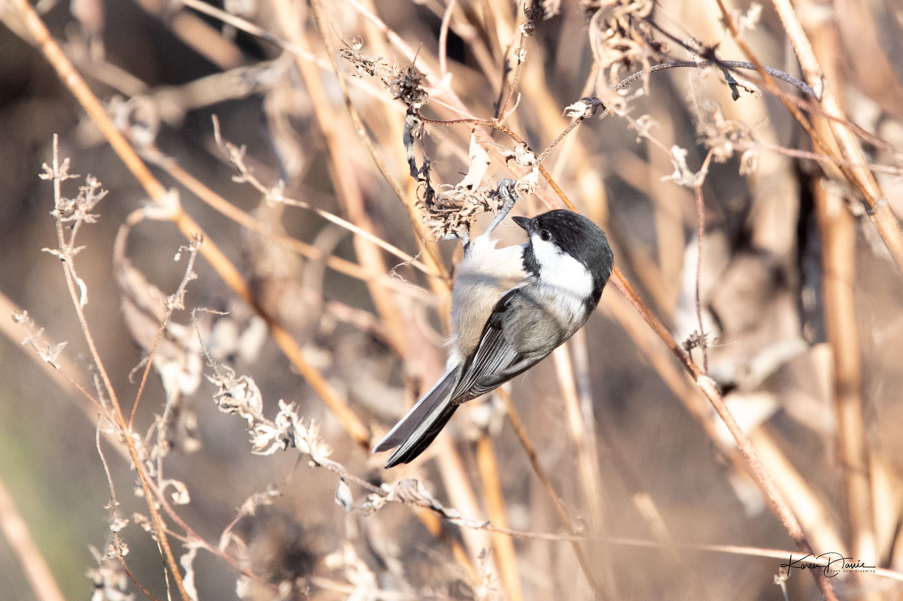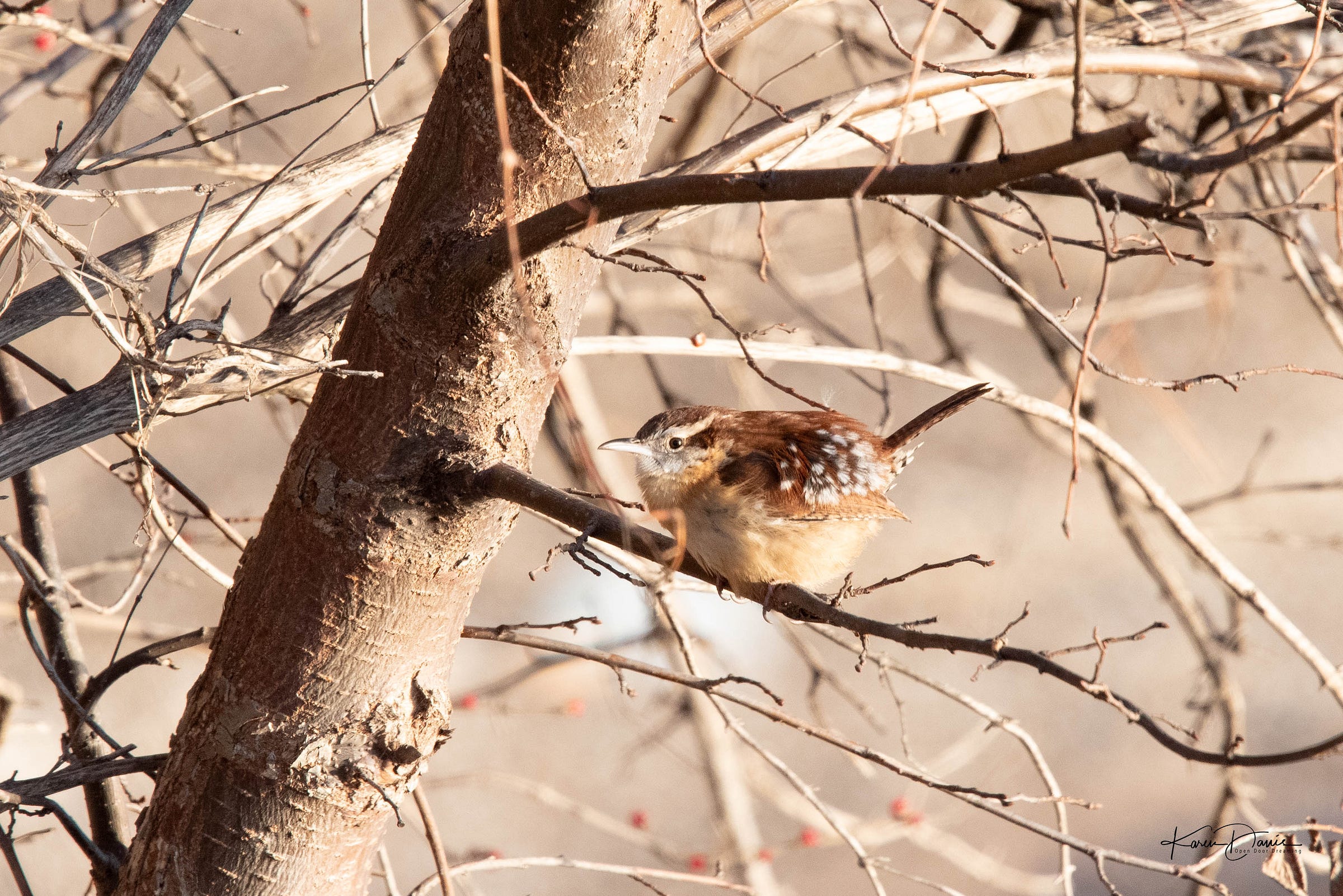 A Carolina wren jumps up on a nearby bush just as the kinglets fly away. He sings his melodious song in what feels like a serenade just for me. He’s there for maybe 30 seconds when he disappears back into the bushes.