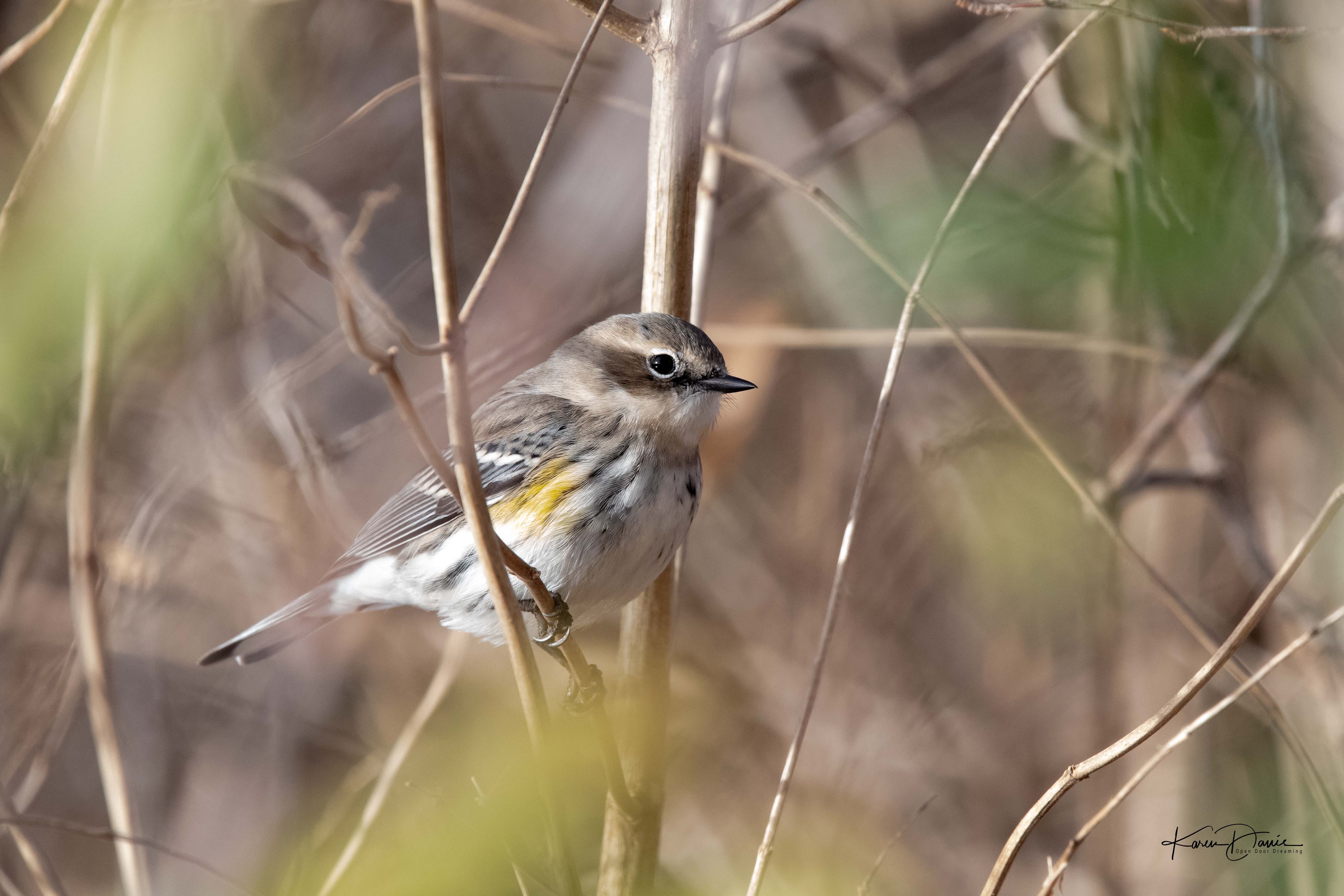 I notice movement in the nearby bushes to my right. One little bird then another zips in, diving between the branches and then back up to the top. The yellow-rumped warblers have arrived. I am never sure how many there are because they are small and they move so fast, but there must be at least a dozen.