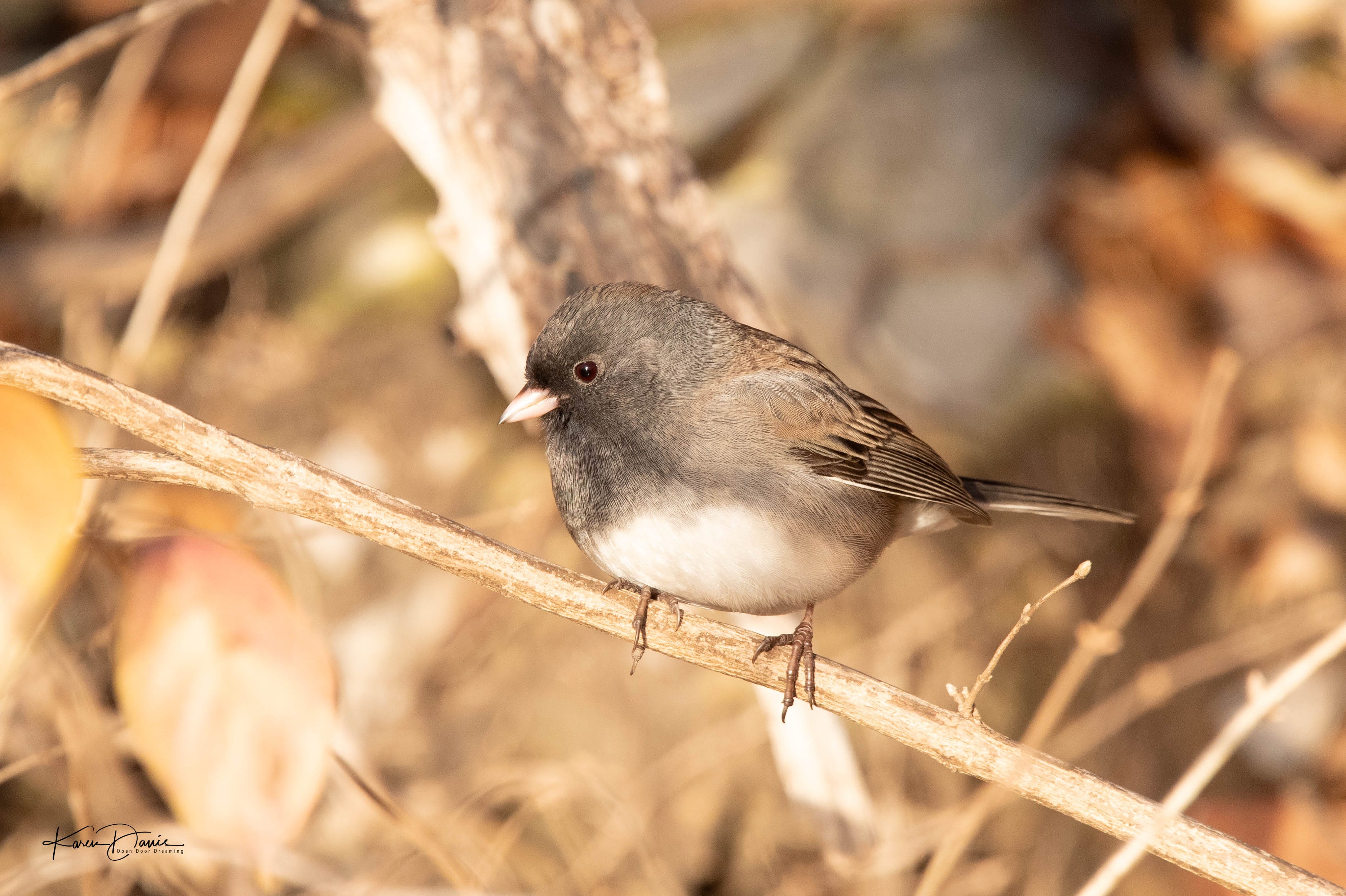 I smile when I see the yellow-rumps arrive, because they seem to be the brave explorers the other birds follow. Right on cue, I see juncos fly in. The juncos like to explore along the ground, bouncing in and out of the tree roots that stick out of the muddy hillside.