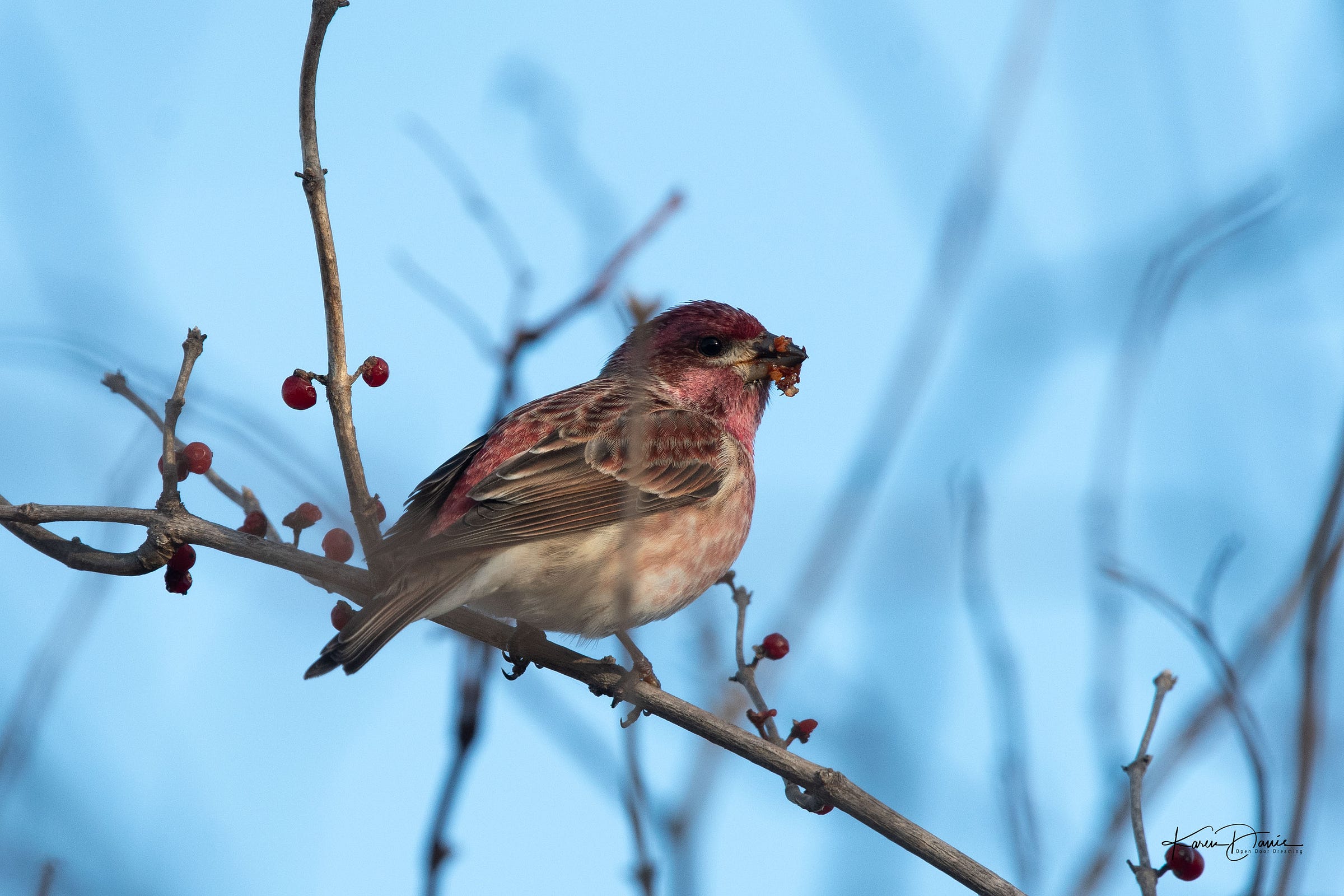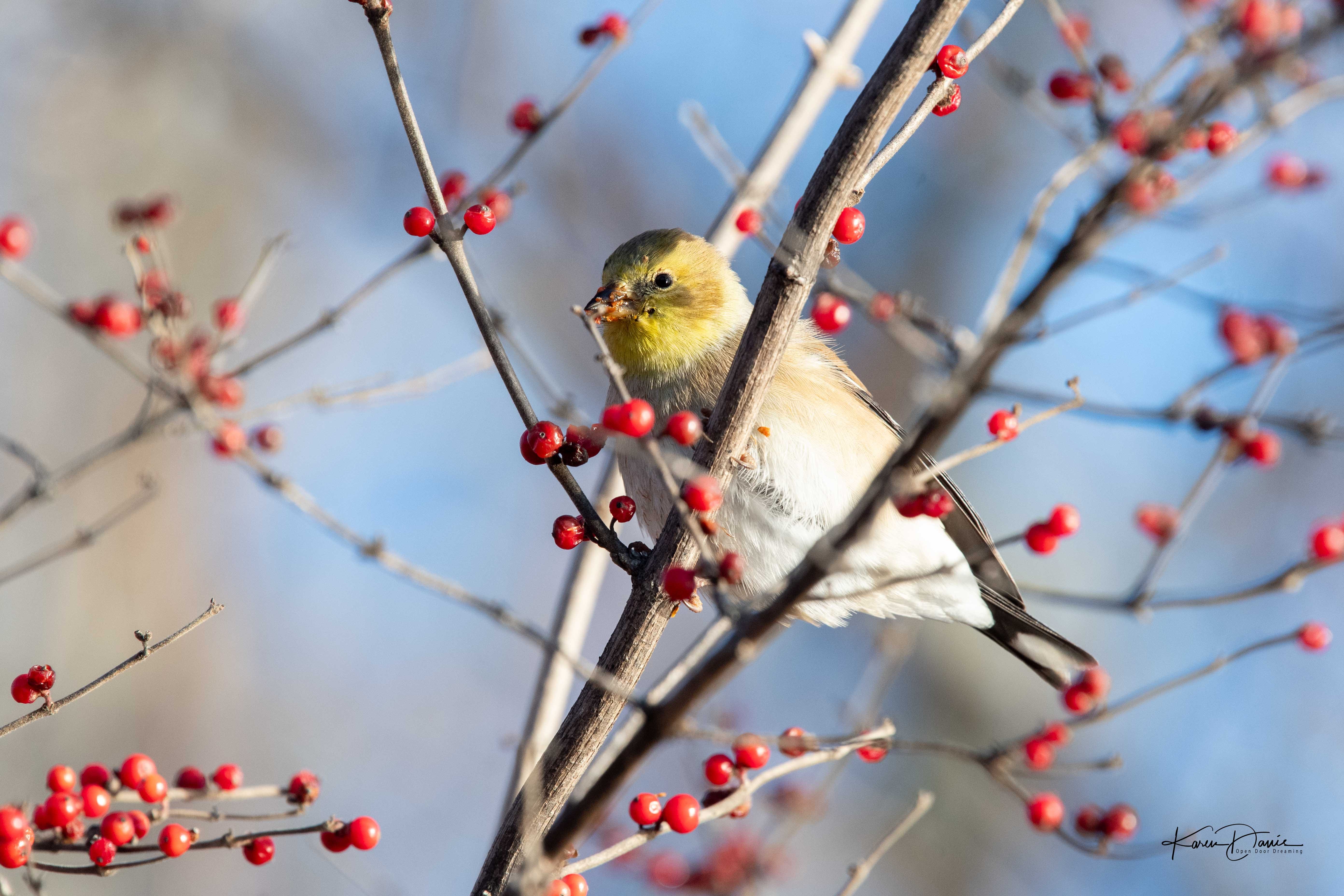 I see another bird munching on some nearby berries and realize the goldfinches have joined the party. They have donned their muted colors for winter, but they are still the embodiment of joy for me.