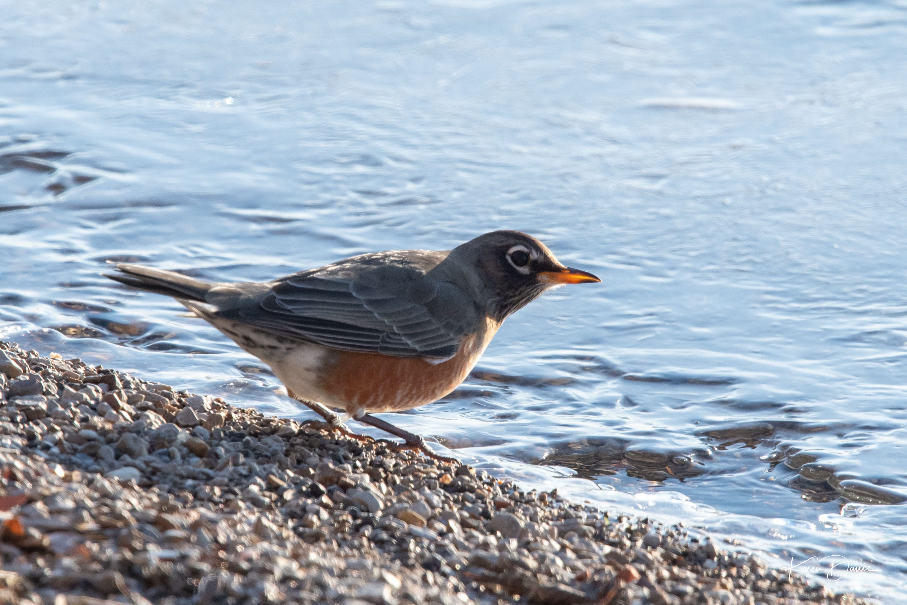 I’m standing at the edge of the lake, just after sunrise. A flock of robins is playing along the shore about thirty yards away to my left. I stand and watch them with amusement as they flit back and forth from the edge of the water to the trees.
