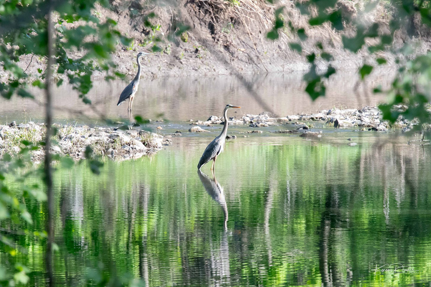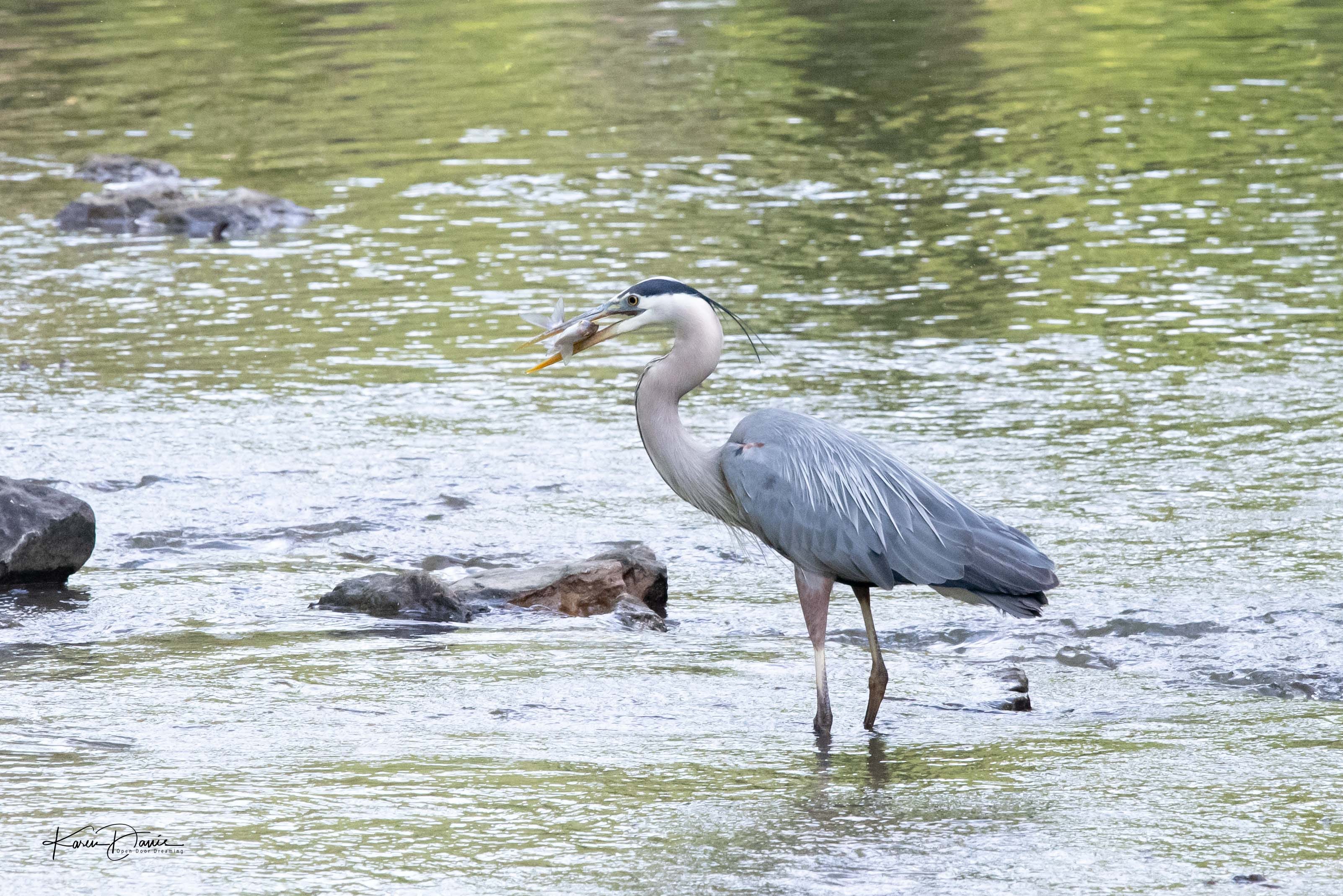 The blue herons out in the creek are vying for the best fishing spots. Their young are likely about to leave the nest and feeding huge babies takes a lot of food. They must have a rookery nearby because I’ve counted as many as nine adult herons in this little spot at one time.