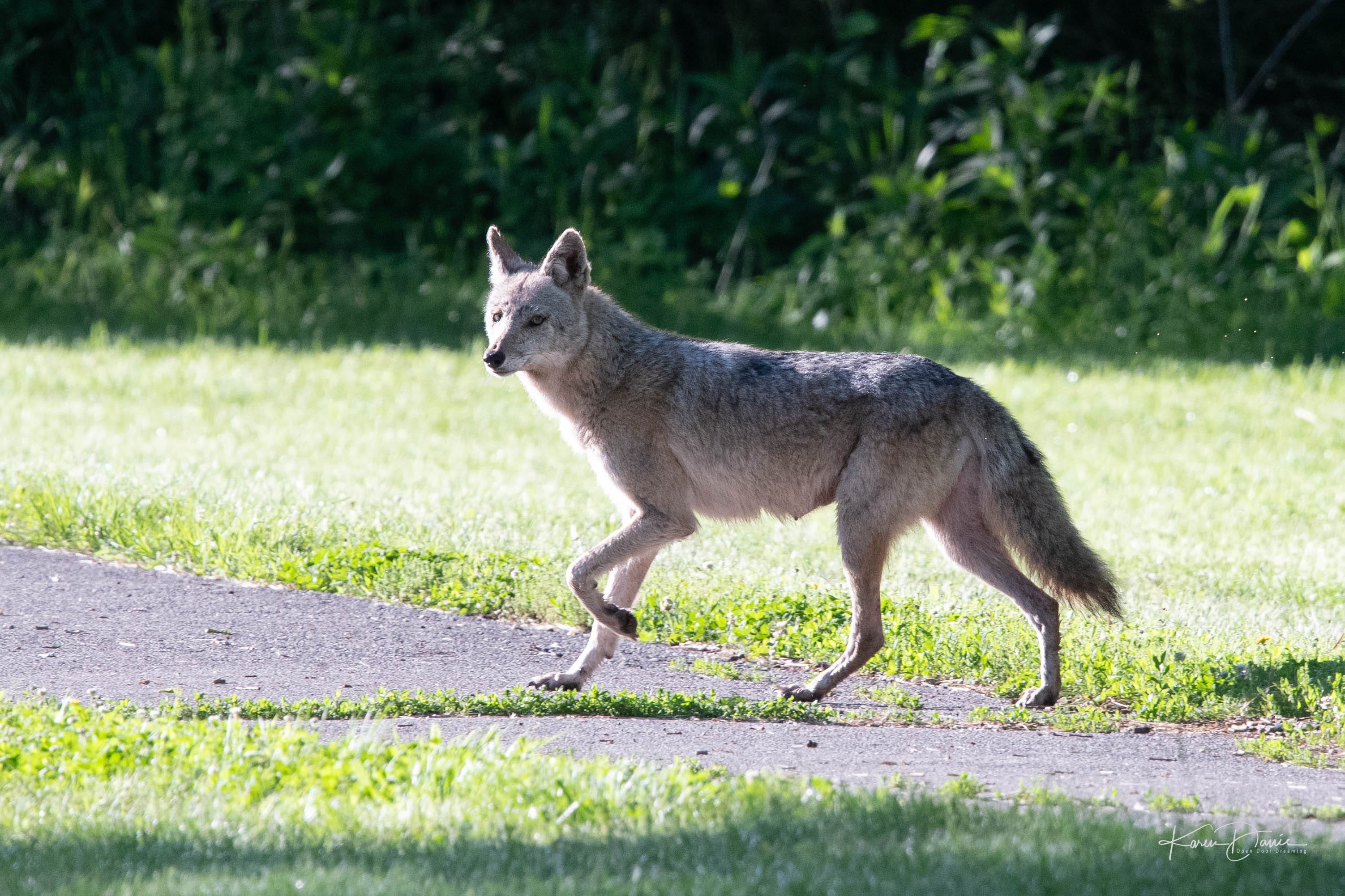 A coyote darts across the trail, the third coyote I’ve seen in two days. Looking closely at this one through my camera, I’d guess she is currently nursing young ones. She probably has to be bolder during the daytime to feed her family.