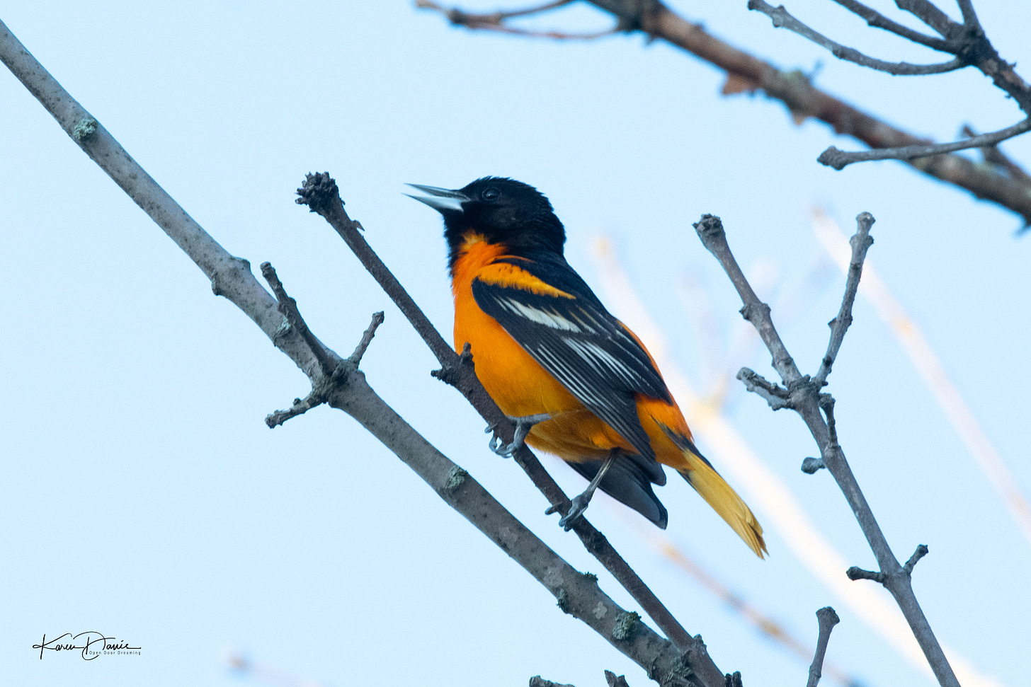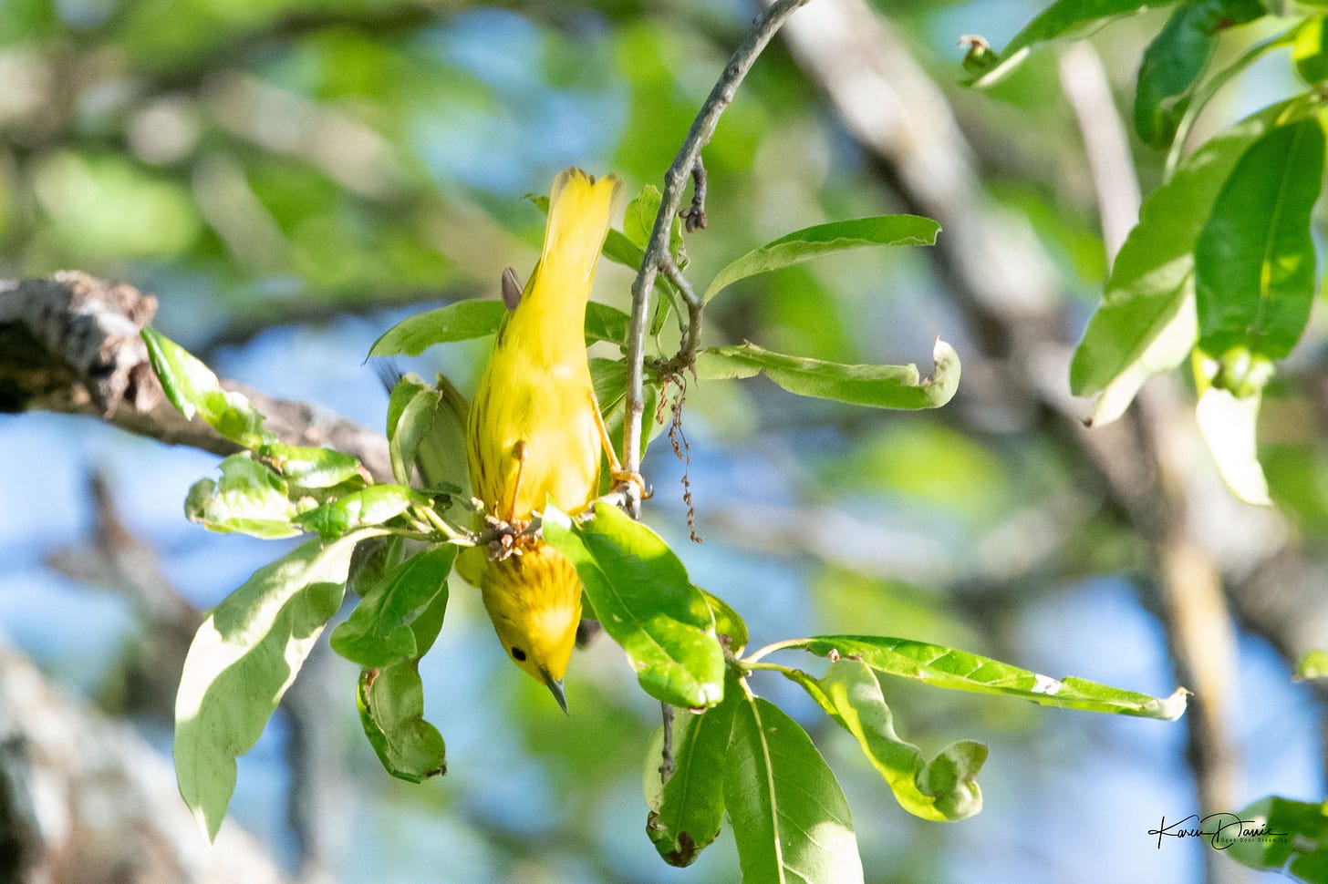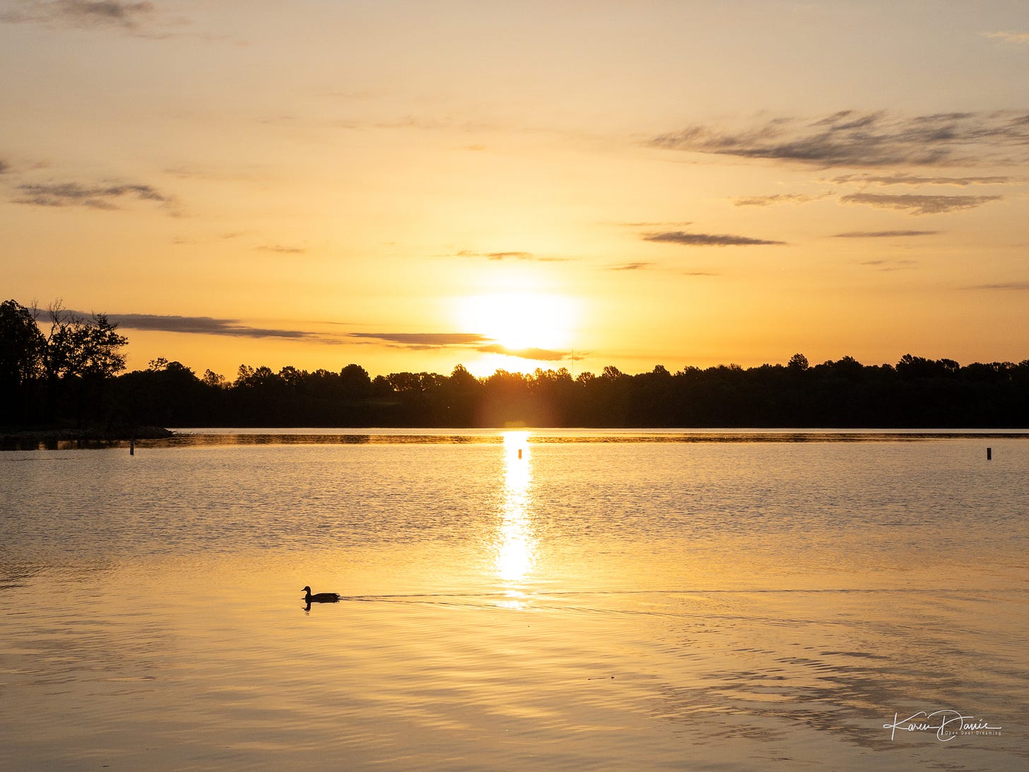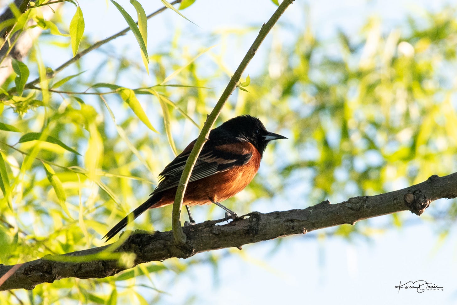 A yellow warbler flits among the branches and I try to remain patient enough to catch him when he finally pops up into the light. An orchard oriole appears on a nearby branch and then almost as quickly flies away across the cove.