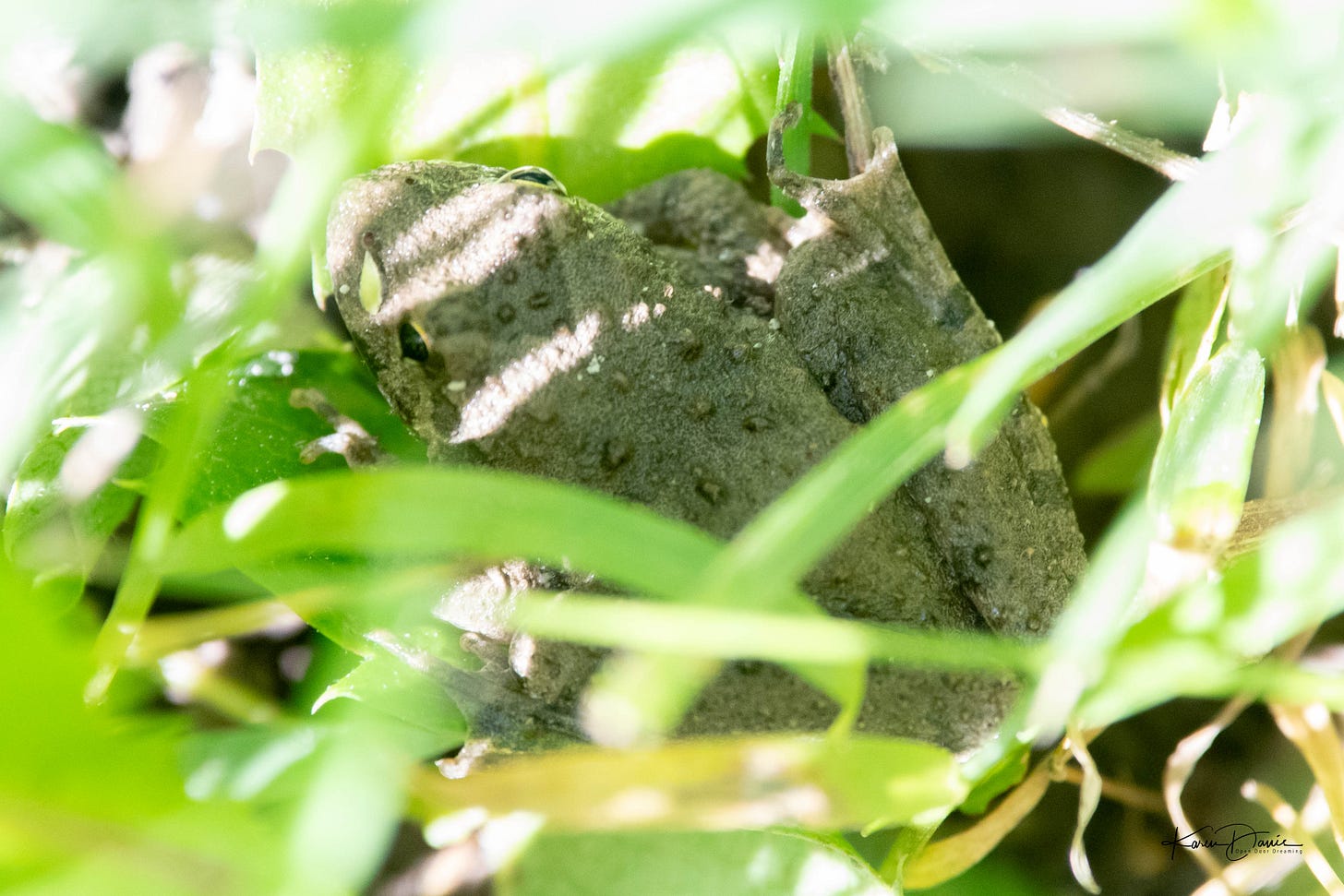A tiny frog jumps across the path in front of me. This frog was no more than an inch in size yet he jumped three feet in the air. I’d never have seen him if I hadn’t seen where he landed.