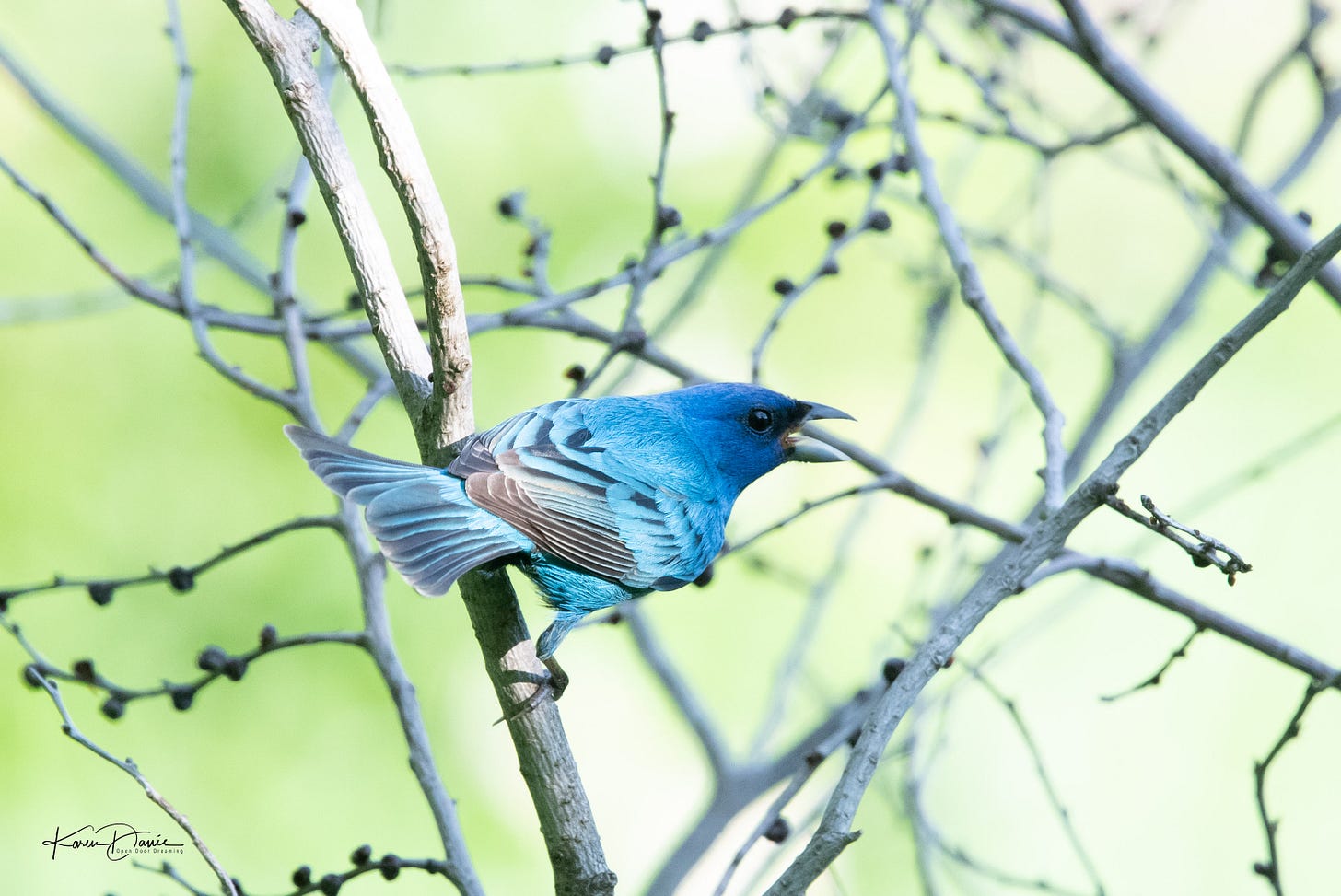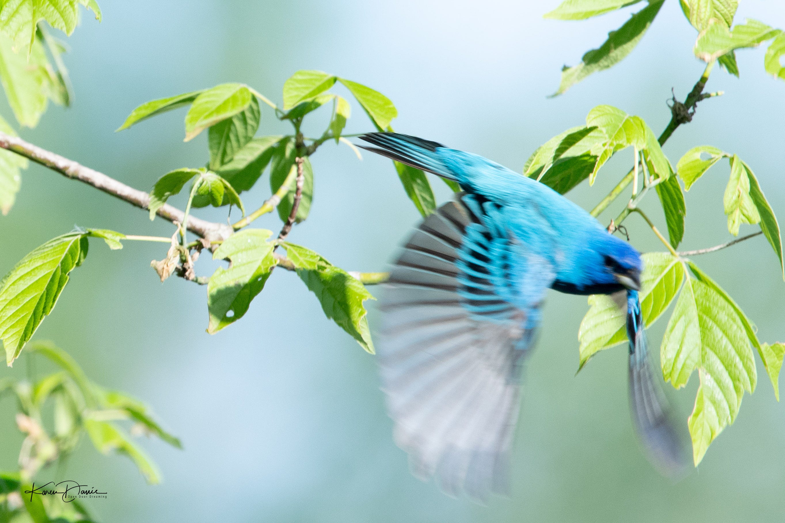 Two indigo buntings are chasing each other in what appears to be a territorial dispute. They’ve been doing this for three days in this spot, so I assume it’s the same two buntings. Will they sort it out and decide to peacefully coexist? Will one eventually give up? Either way, it’s a blessing for the photographer because their focus on each other means they are paying no attention to me.