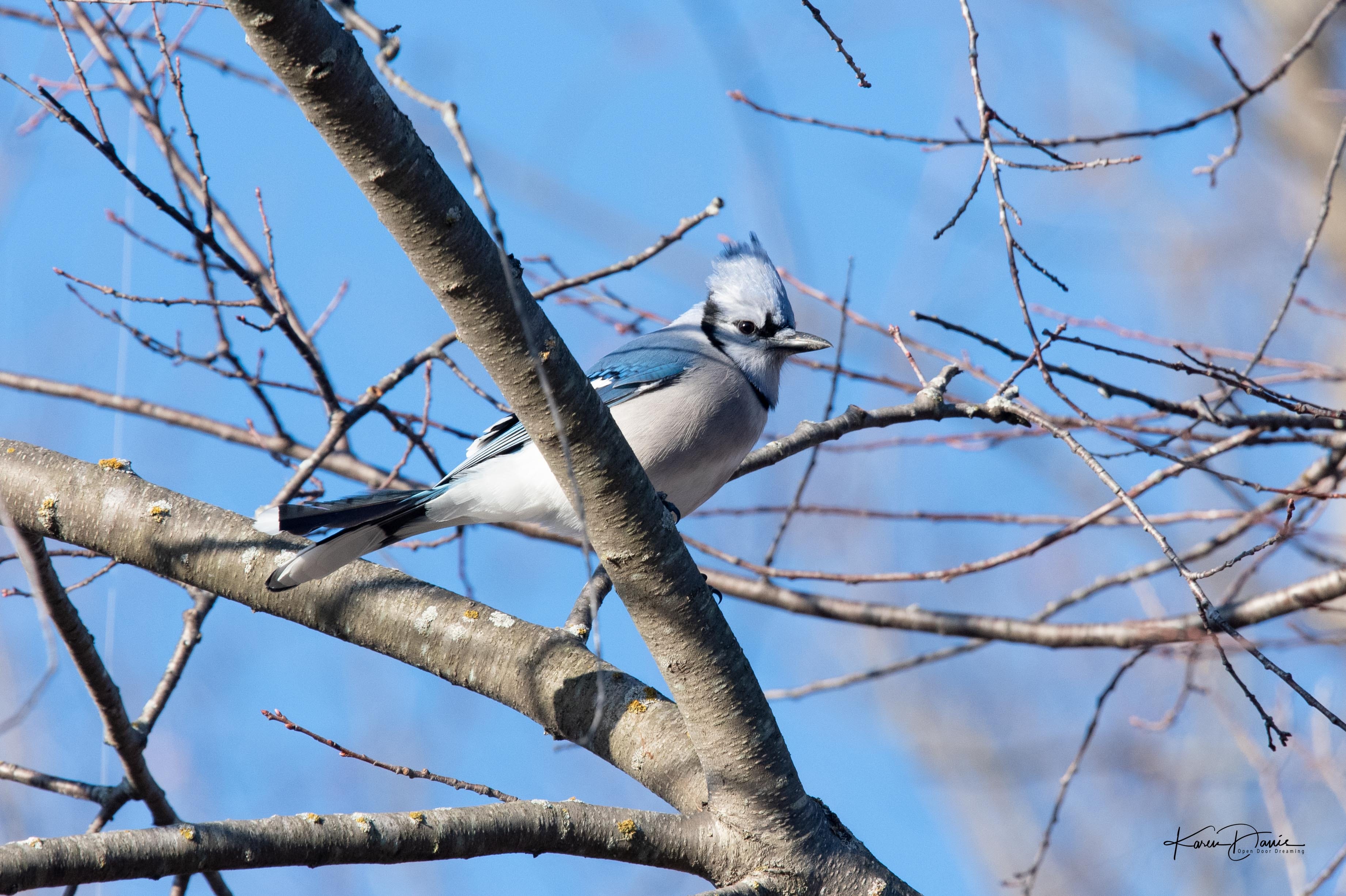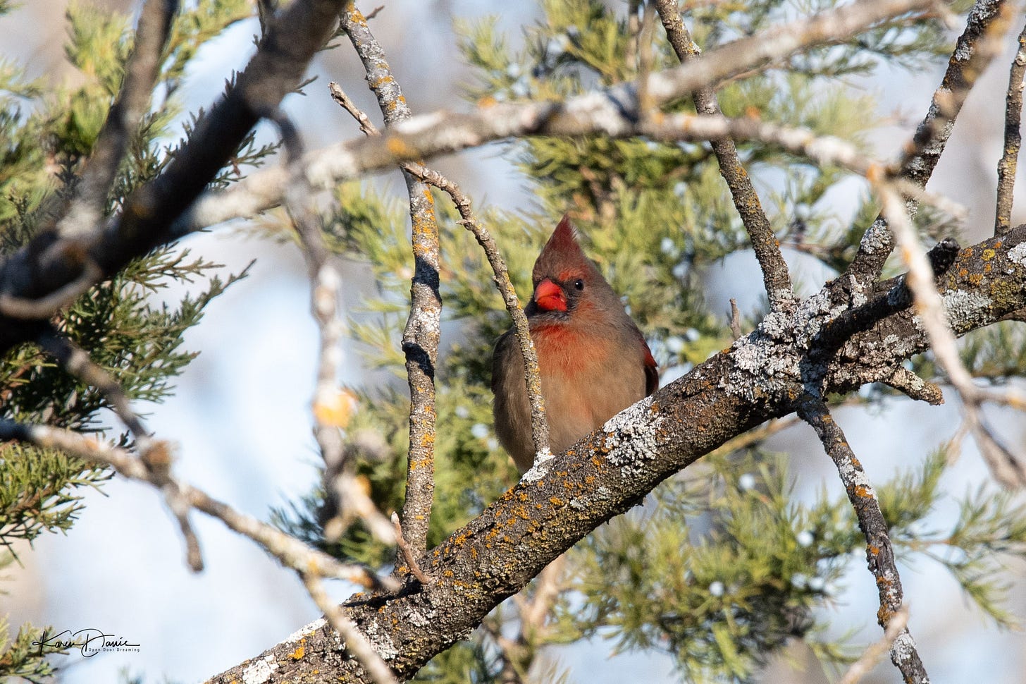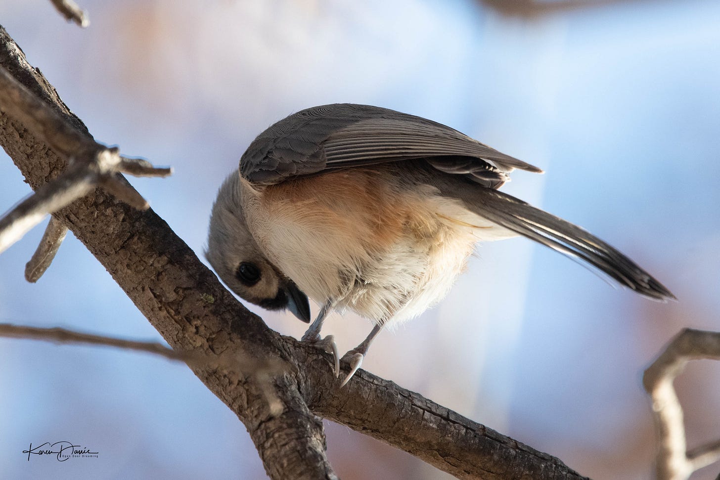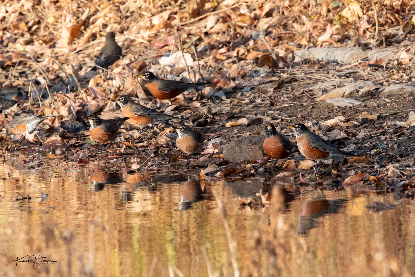 Meanwhile the robins are splashing in the water’s edge, perfectly camouflaged by the dry leaves. The noisy blue jays are chasing each other back and forth between the trees and the tufted titmice are grabbing seeds and berries of their own. Titmice will grab a seed and fly up to a branch to pulverize it against the wood and then fly back to get one more. One at a time, over and over.