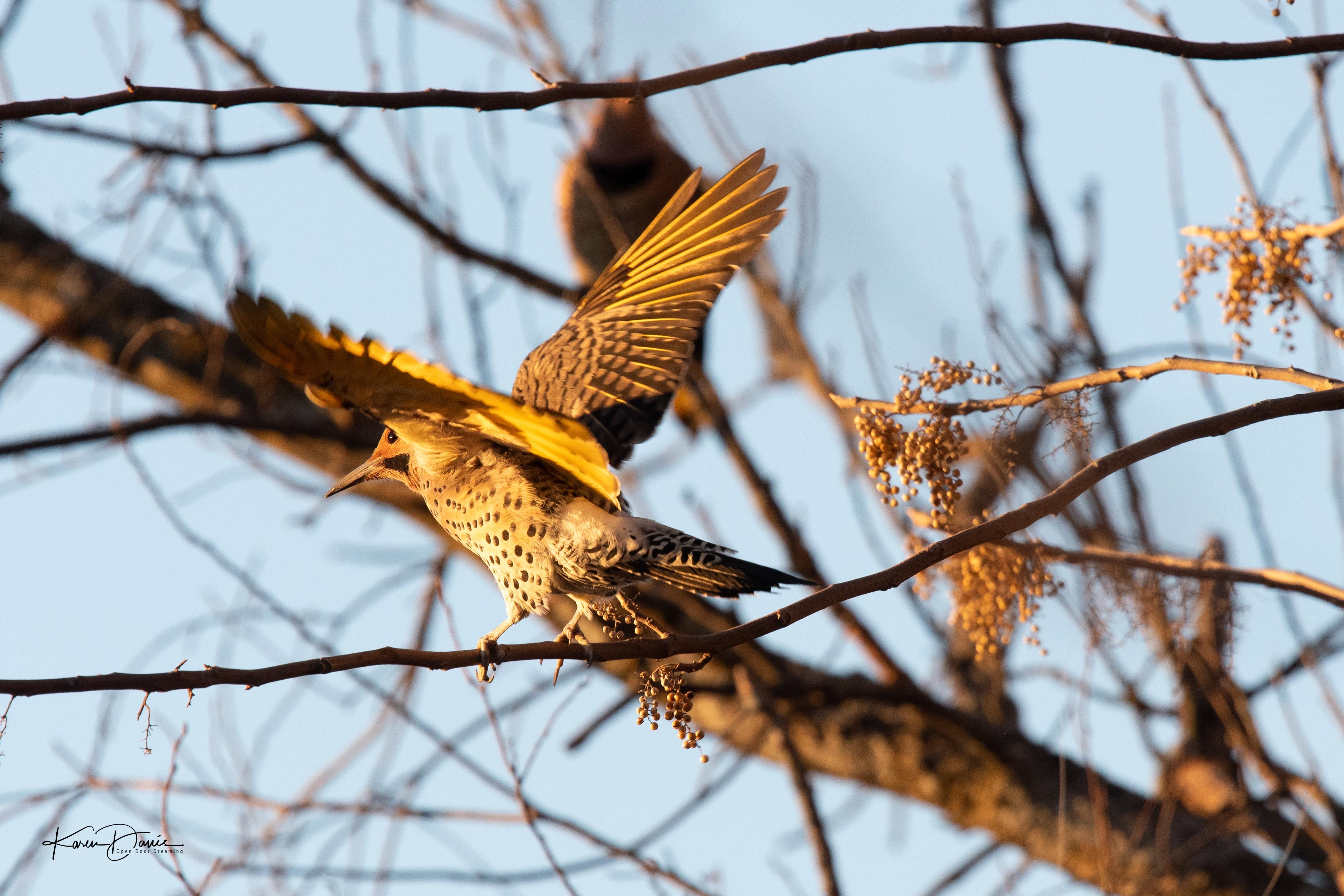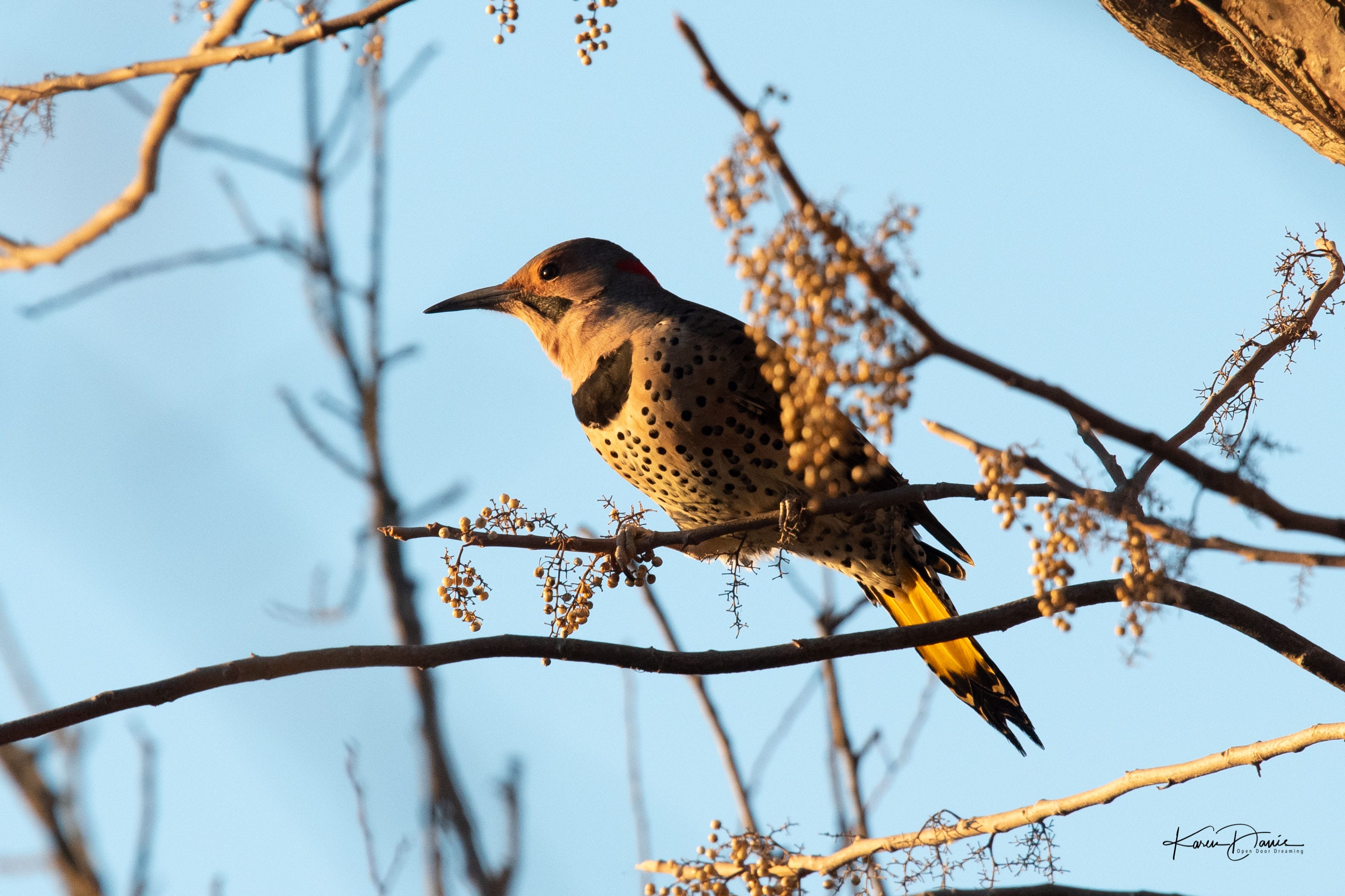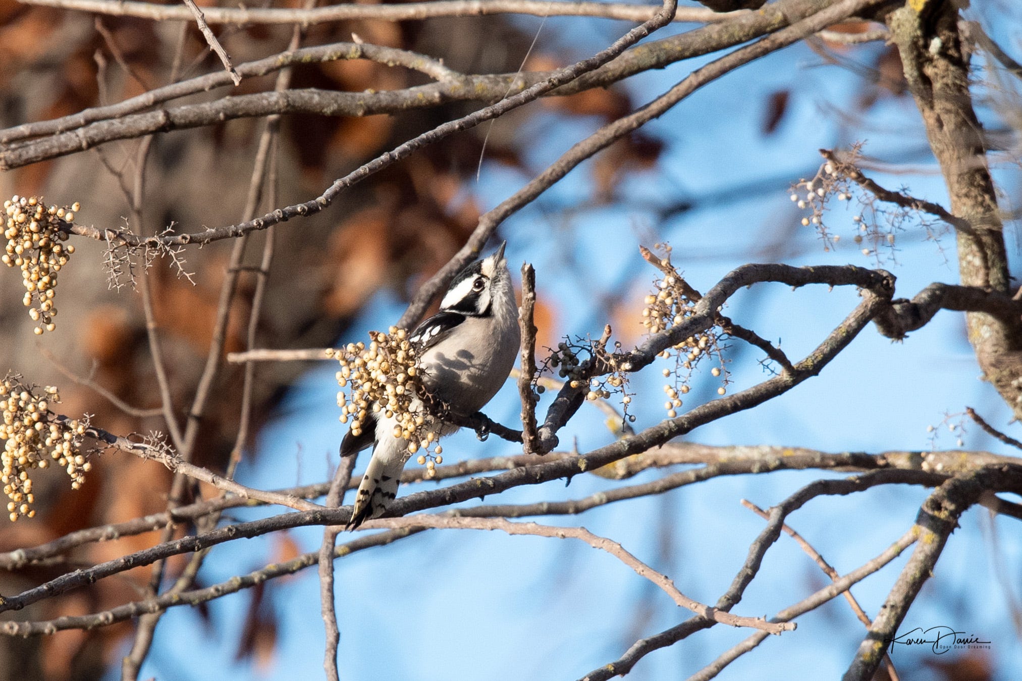 After a little while I take a short walk and find another spot where I can sit in the sun partly blocked from the wind. I’ve chosen well without knowing it - there are lots of poison ivy berries (aka bird candy) in the trees. Flicker is the first bird I see discover the berries. He alternates between eating berries and looking to make sure no one else is encroaching on his find. At some point he flies across the cove. A downy woodpecker flies in to eat the berries and within a minute the flicker is back to chase her away. Eventually he relents and shares the berries with another flicker and a pair of downy woodpeckers.