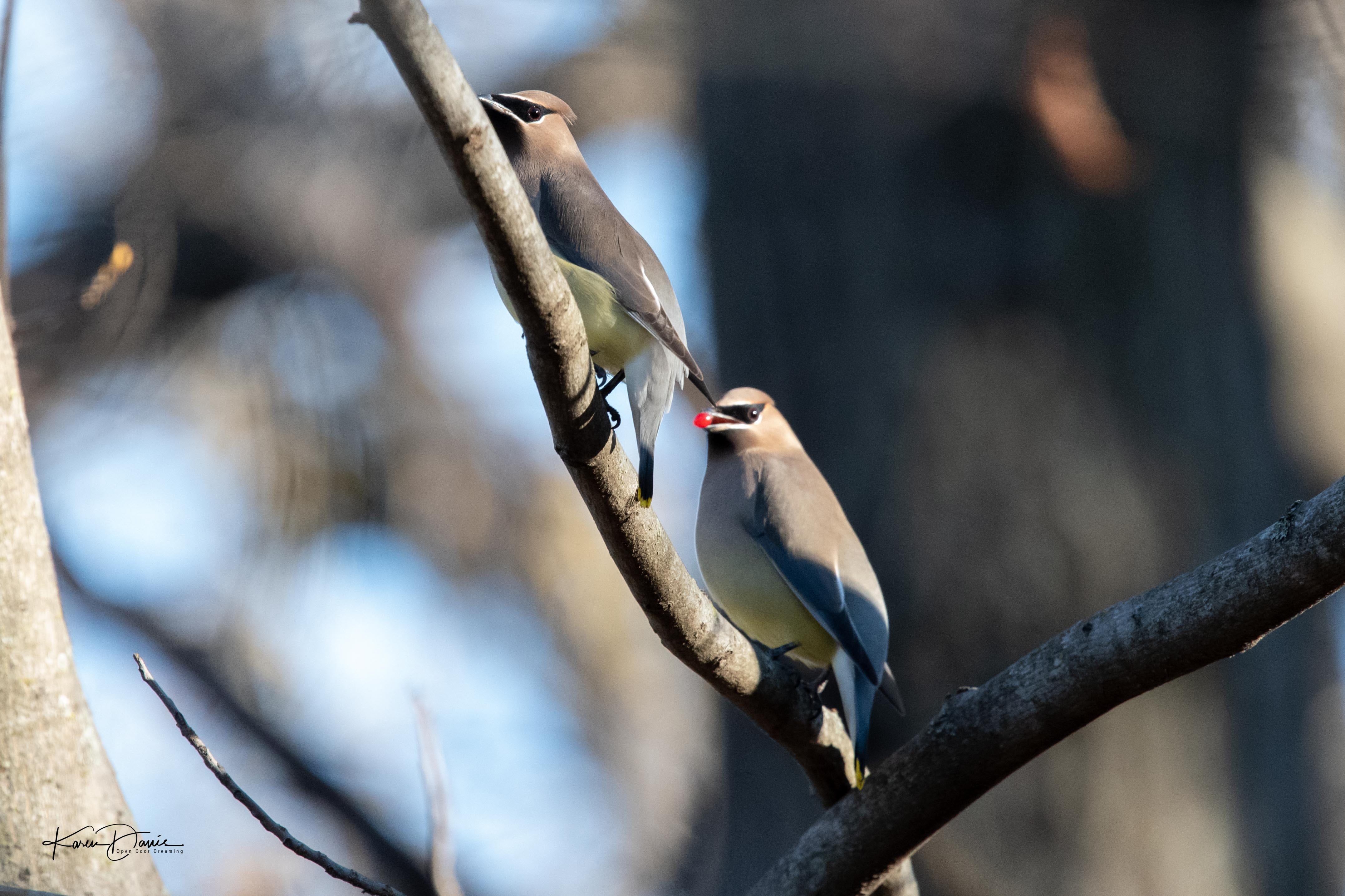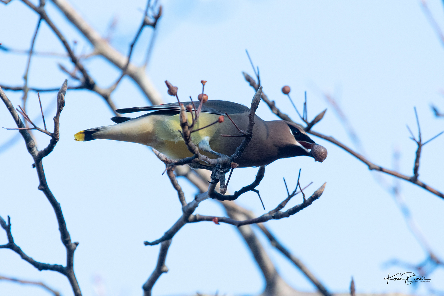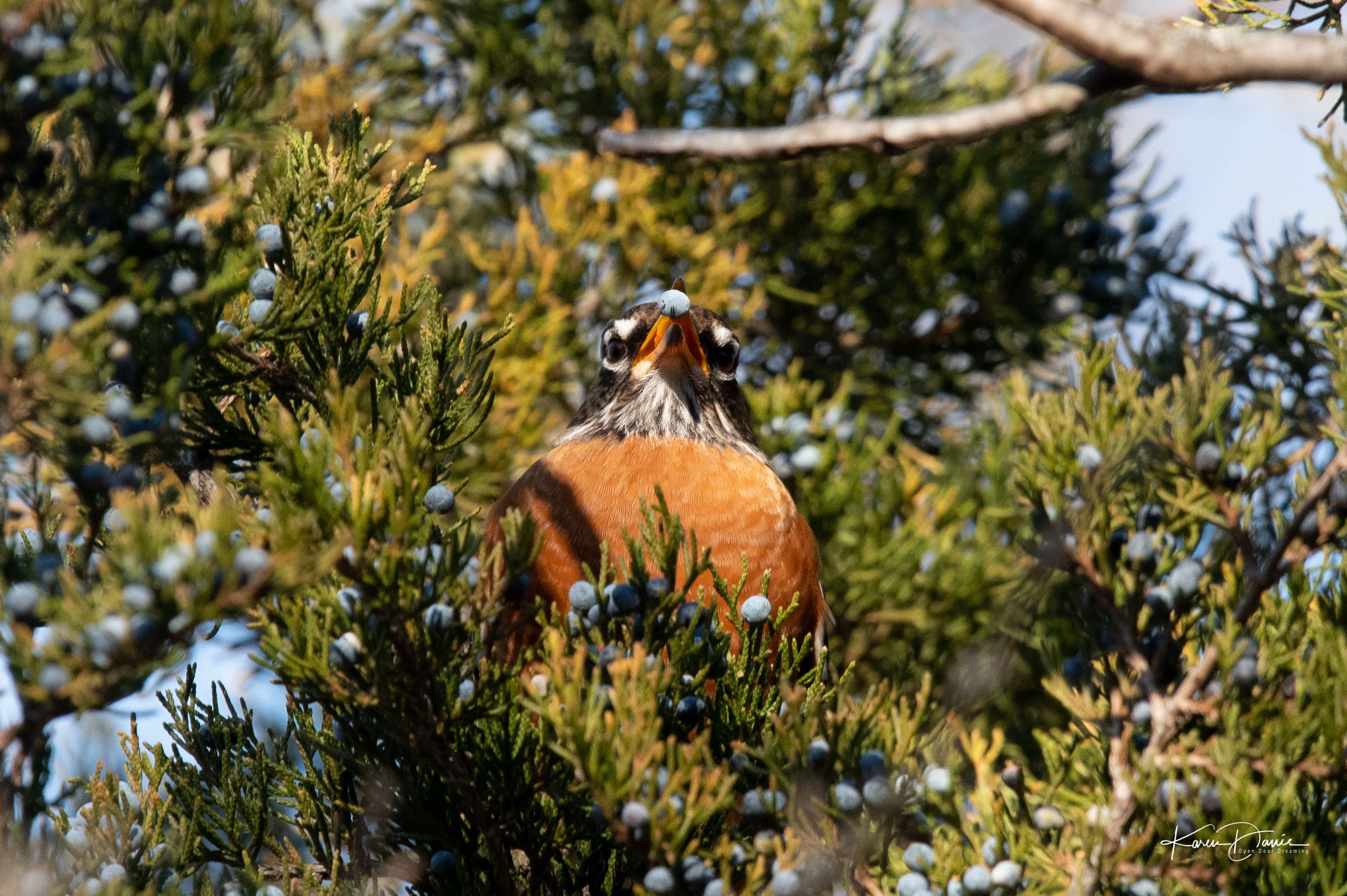 Eventually a couple humans showed up with their dogs, scaring the birds away. I headed off down another trail where I found a large flock of robins feasting on juniper berries and some other berries I can’t identify. There is a huge winter roost of robins in that area and there were dozens around. The cedar waxwings came to join in the berry feast and a purple finch popped up on a branch for a second and was gone - I never saw another one!
