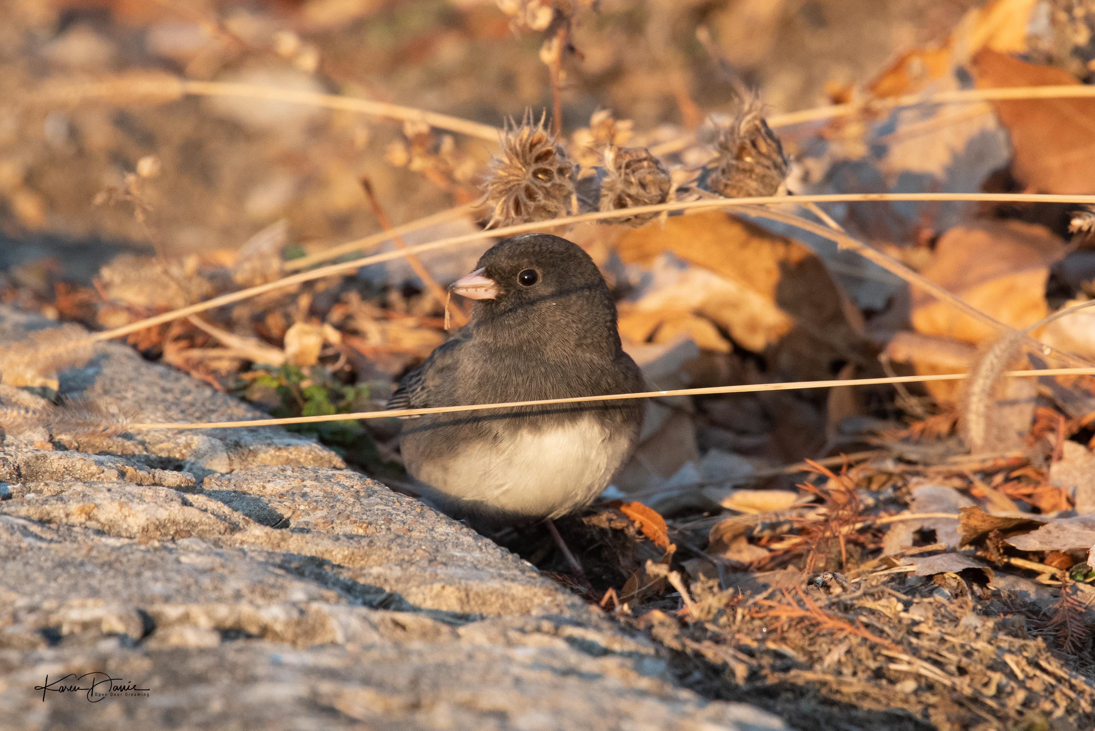 Sunrise. Clouds have cleared. There’s not another human around even though I’m in a public parking lot and it’s Saturday. I look up from the spot next to the dock where I have sat down to watch the sunrise and notice a flock of dark-eyed juncos playing behind me on the rocks. I manage to turn around without scaring them away, which is lucky because while junco’s will tolerate me standing right next to them, they sometimes fly away when I am sitting on the ground.