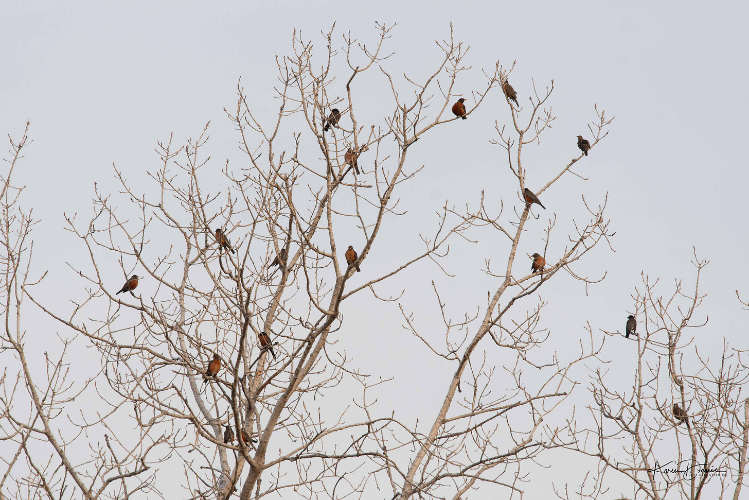 I was astonished to note that after six minutes they were still streaming out at a rate of hundreds and hundreds per minute. I kept watching. They kept coming! More robins than I have ever seen. I knew there was a winter roost at the lake, but I’ve only seen a few hundred at a time. At one point I thought it had stopped, but that lasted less than a minute before the stream of robins started again. All told they streamed past me at the rate you see in the video for nineteen minutes! 19!! Thousands of robins!