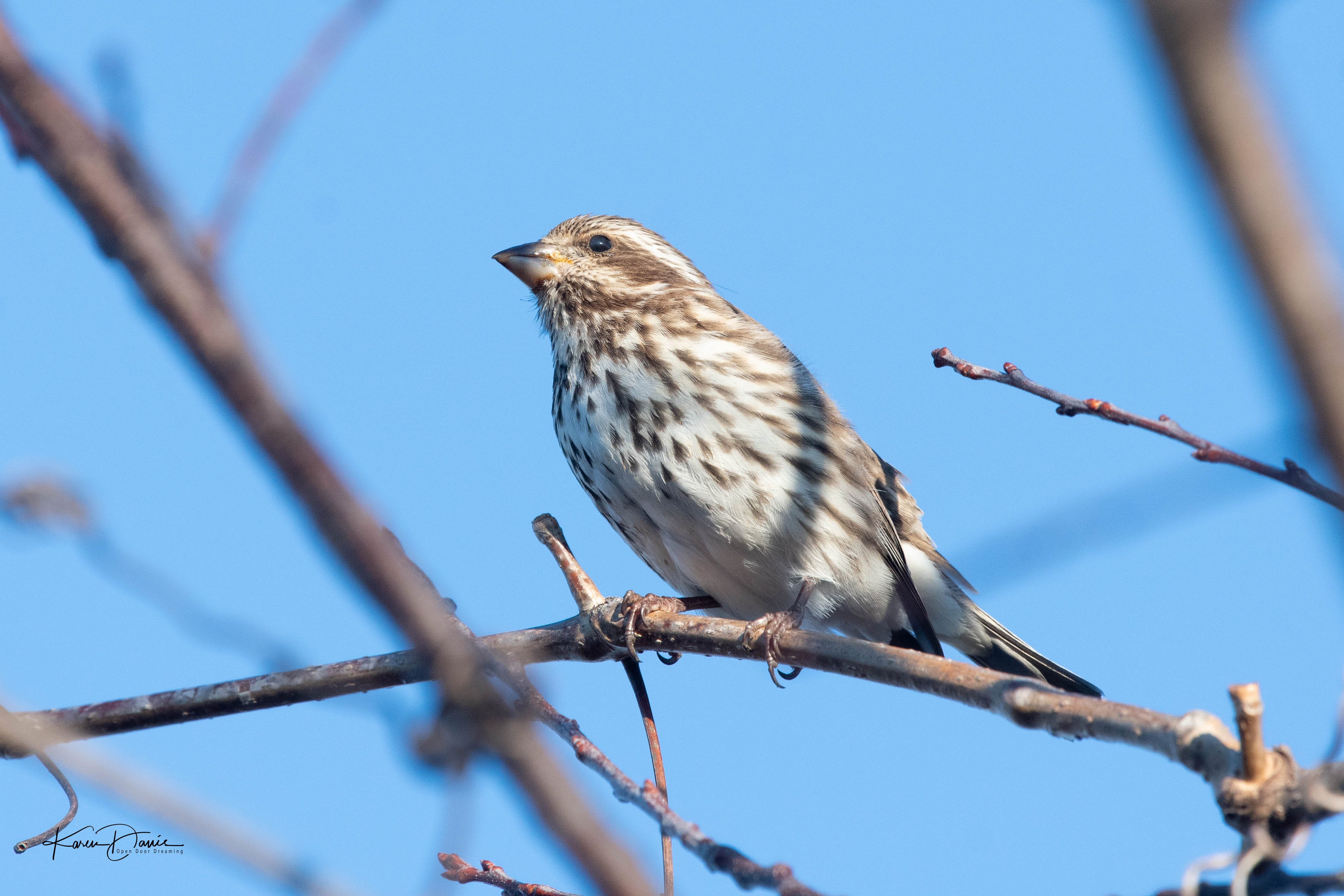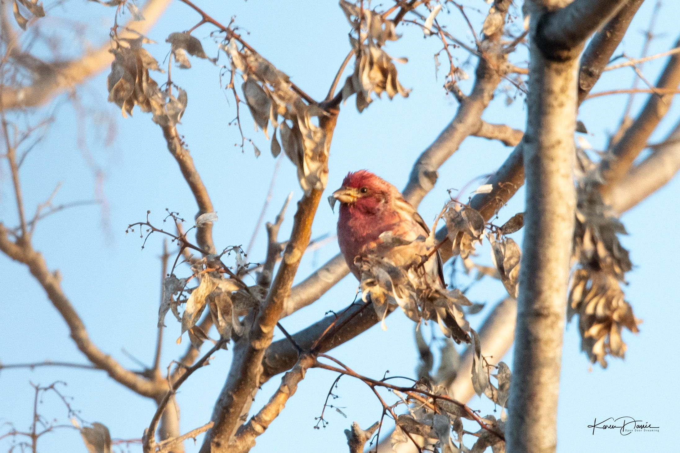 What’s here now are purple finches! I’ve seen them every morning this week, which is such a pleasure, as in some years they don’t visit here at all. The raspberry-painted males are fewer and harder to spot in the trees and bushes than the females with their distinctive eye stripe.