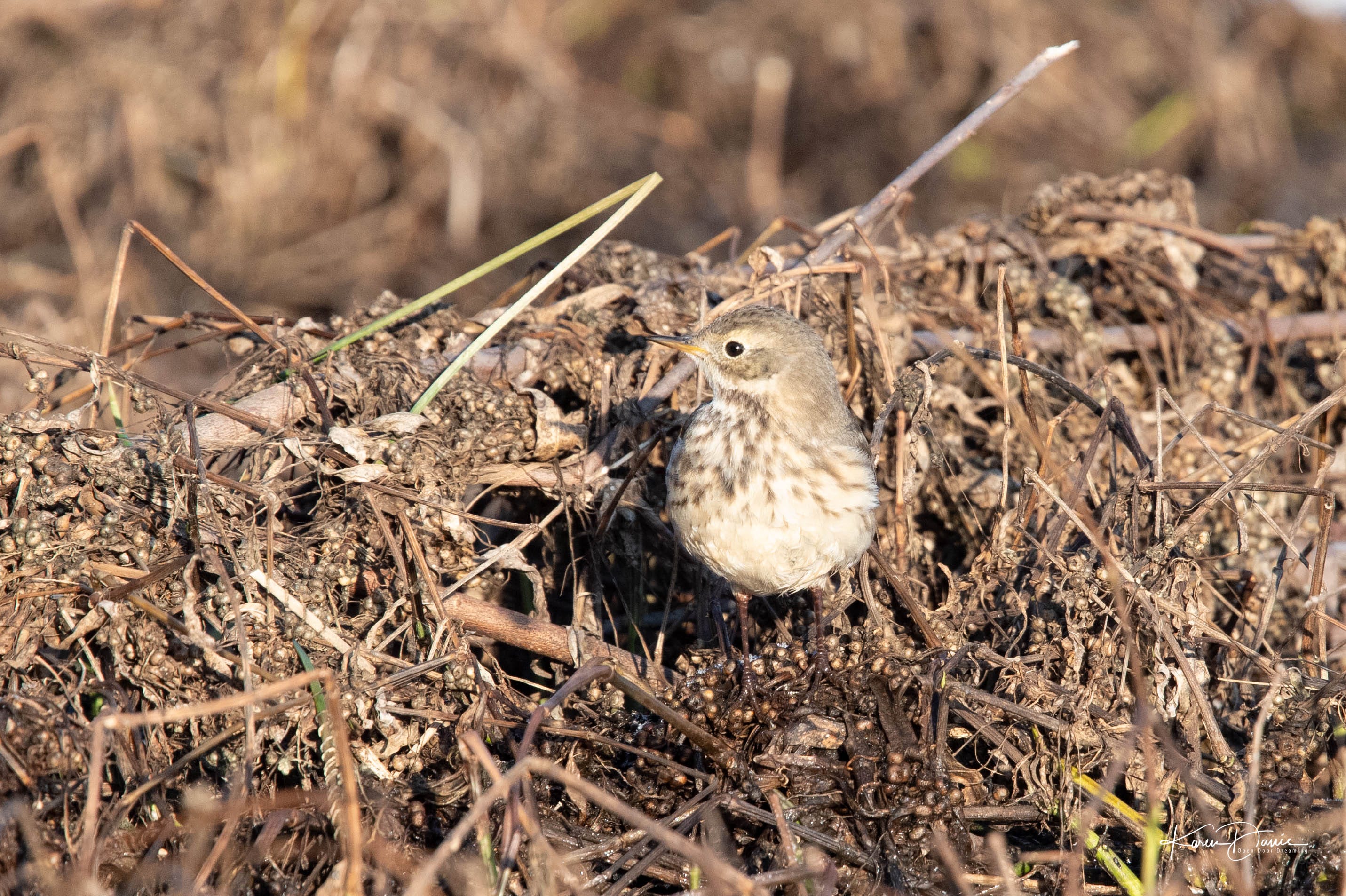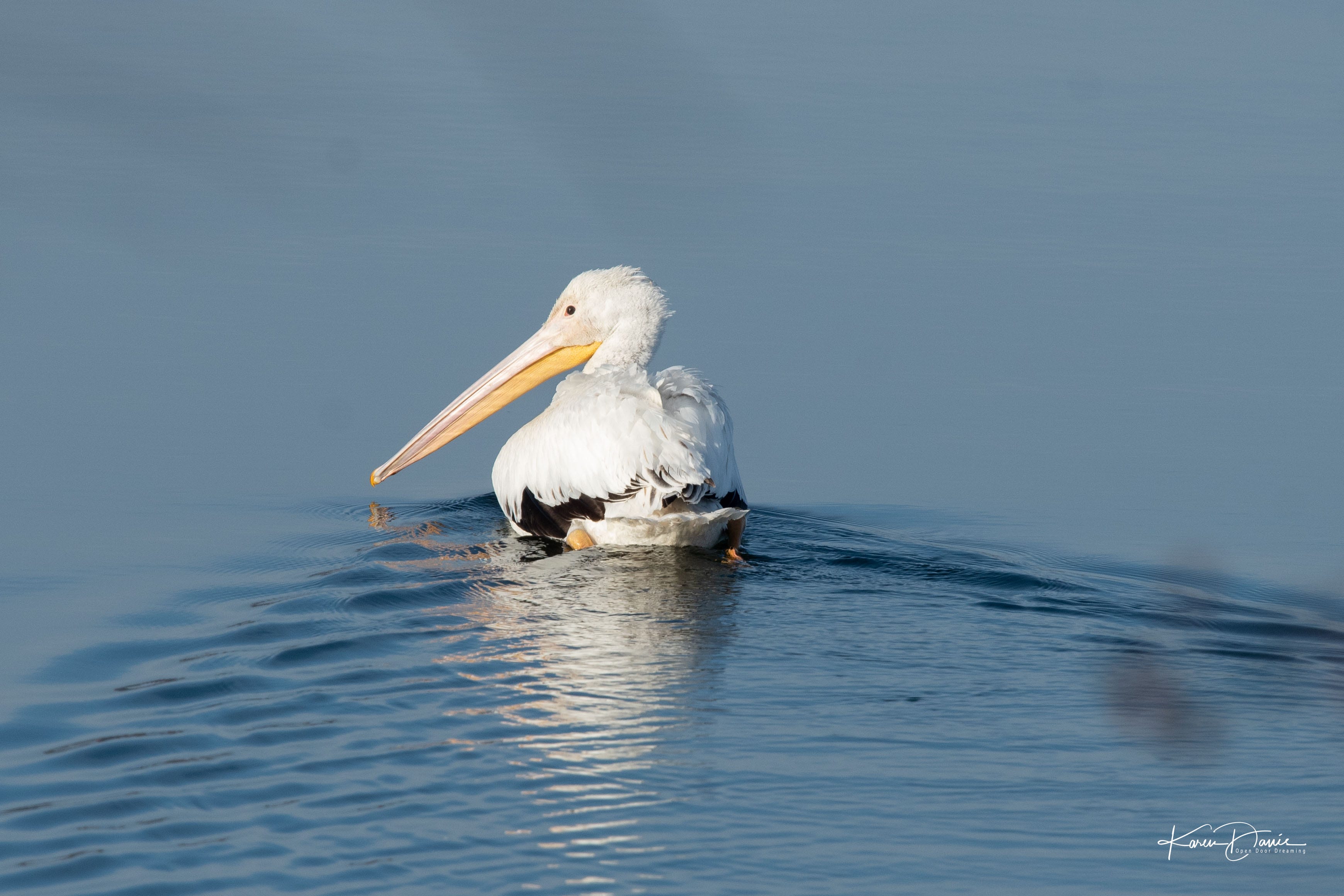 What’s here now, in the lucky moments, are the surprise birds that can show up anytime through the winter. This week’s first surprise was another American pipit tail-bobbing near the water’s edge. This week’s second surprise was a lone pelican, quietly swimming away as I walked near the shore.