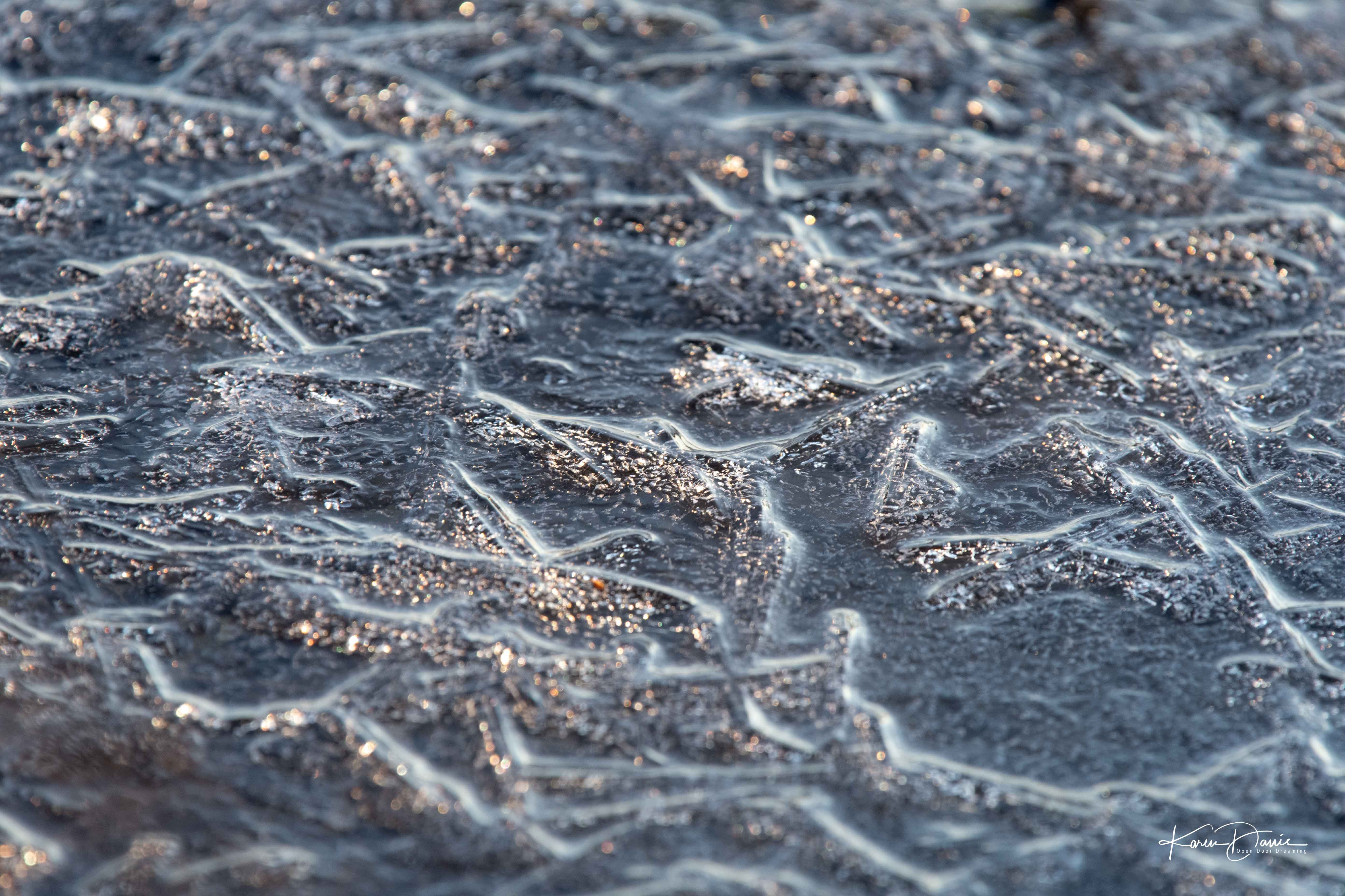 What’s here now, occasionally and only on the most still mornings, are tiny ice scupltures where the water has splashed up on the remaining vegetation. Little sparkles and glimmers most delightfully seen as the sun rises and shines on them.
