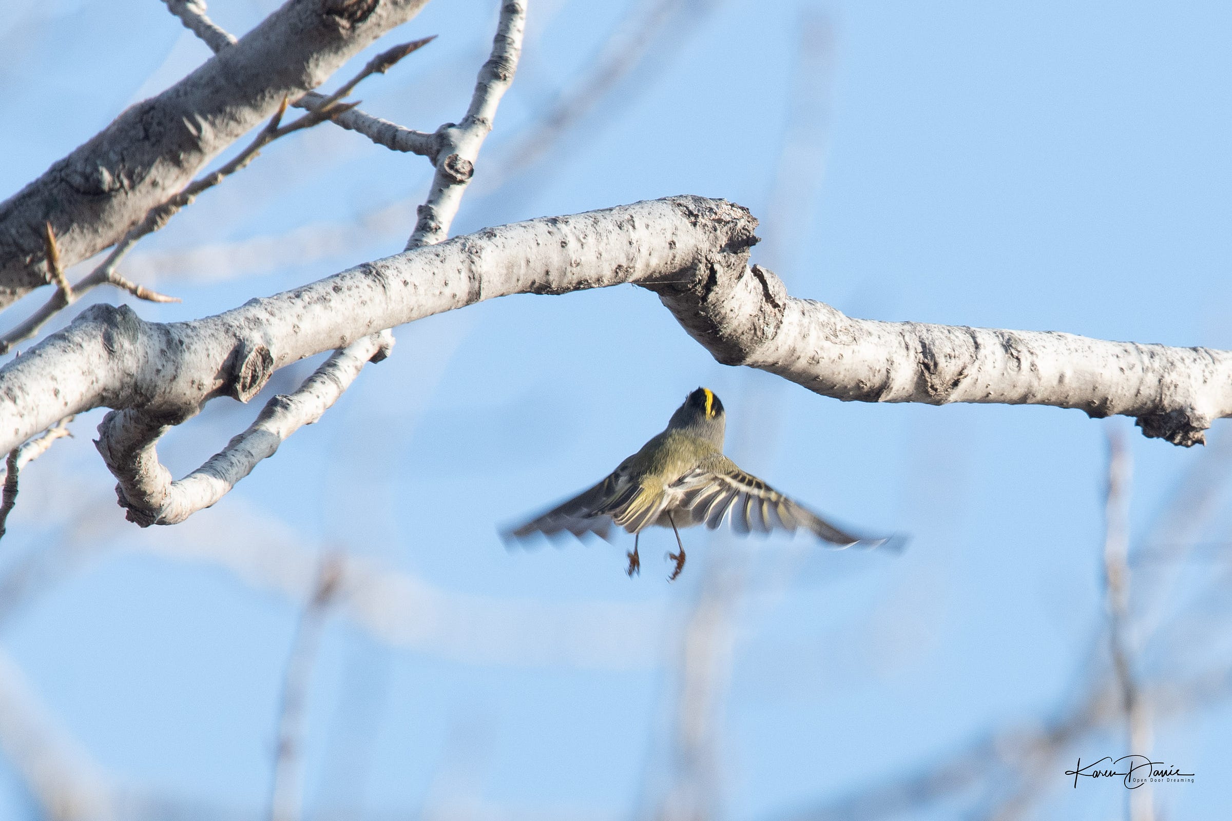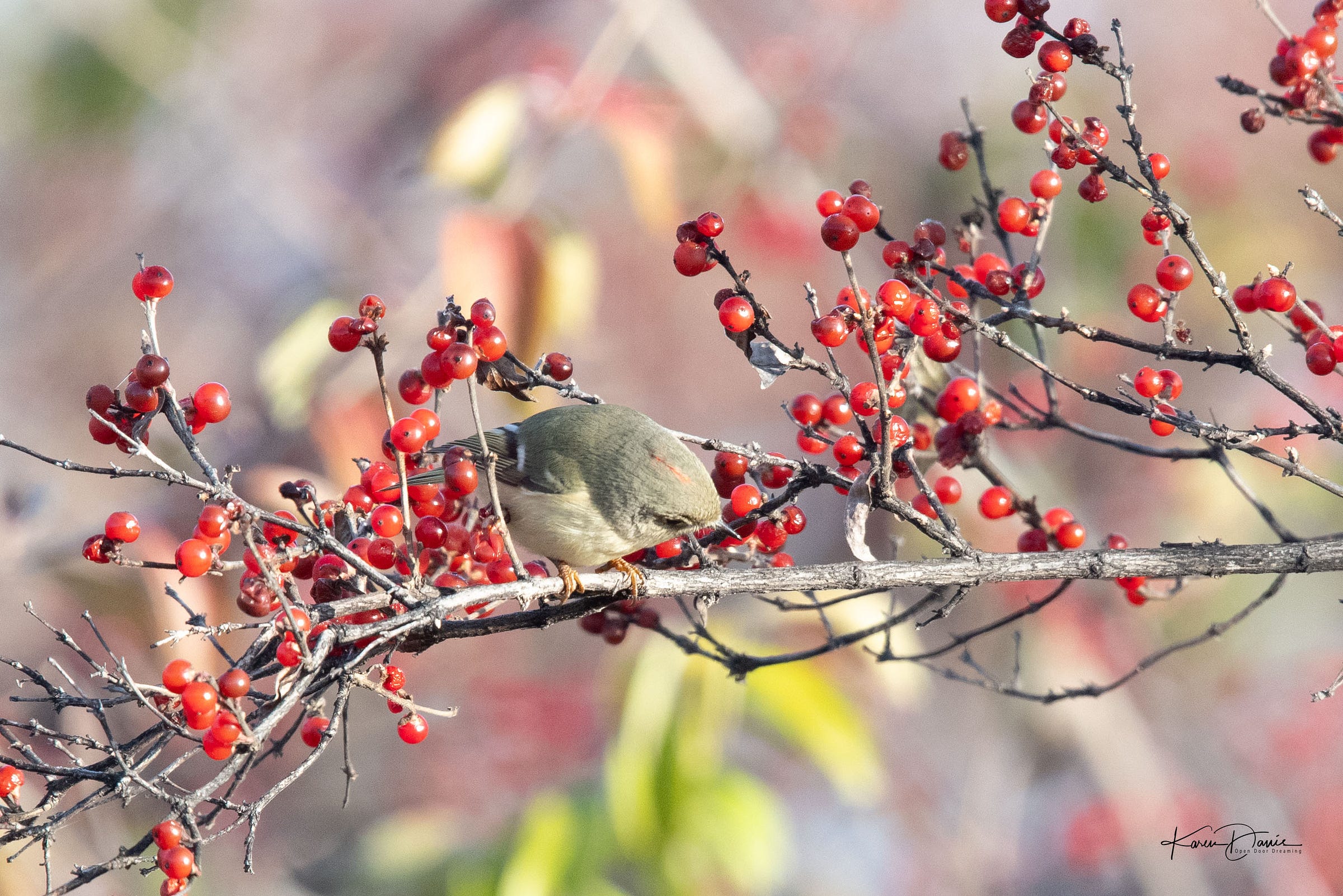 What’s here now are the occasional kinglets. Most days, I will see at least one ruby-throated kinglet zip through the bush in her zig-zag-never-stops manner. Only once (so far) have I seen her cousin, the golden-crowned kinglet, flying up to a branch and then quickly disappearing into the brush.