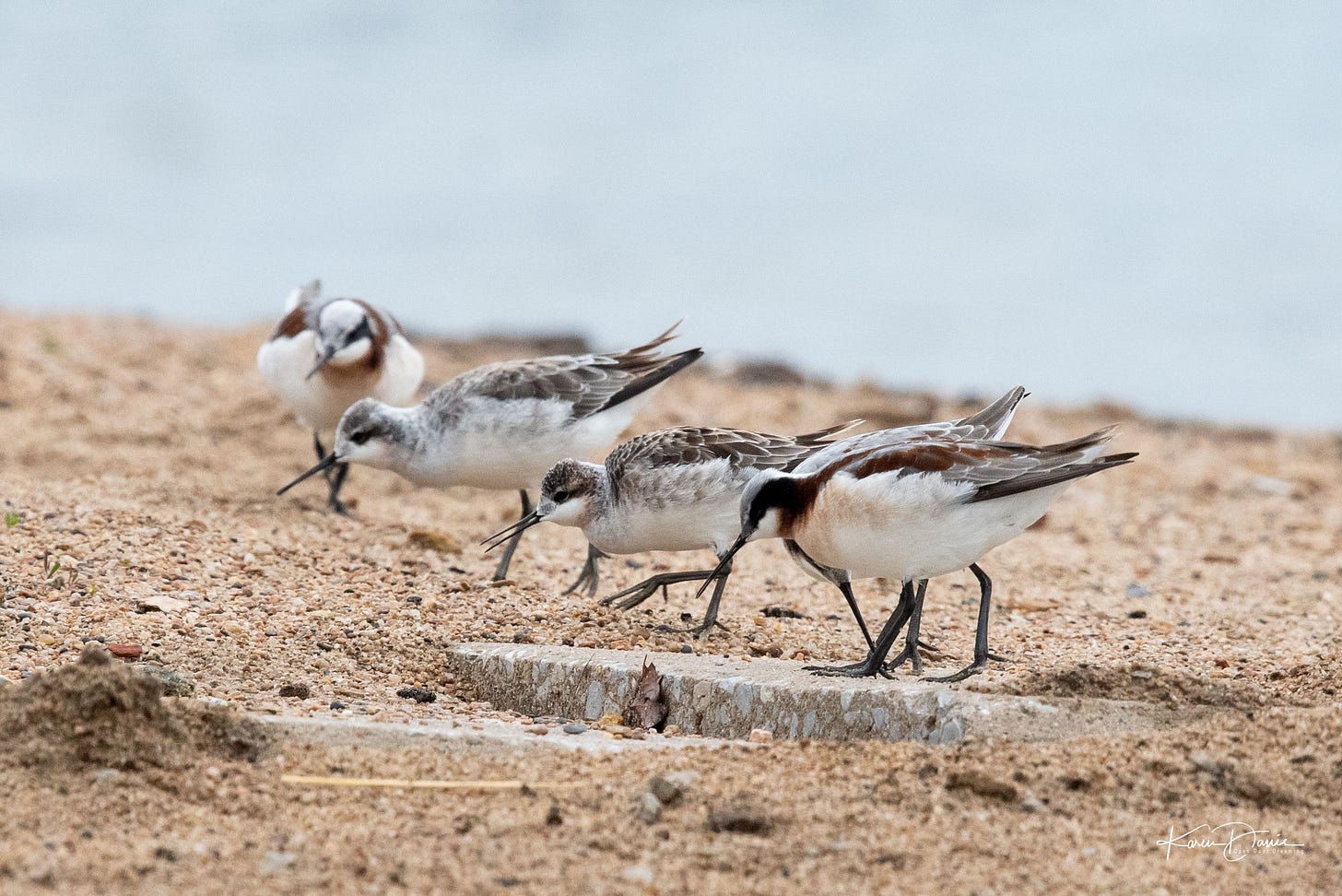 I will write of the maroon and blue Wilson’s phalaropes visiting me for the first time! Six individuals moving nearly in harmony both in the air and on the ground, busy gathering tiny morsels I can’t see.